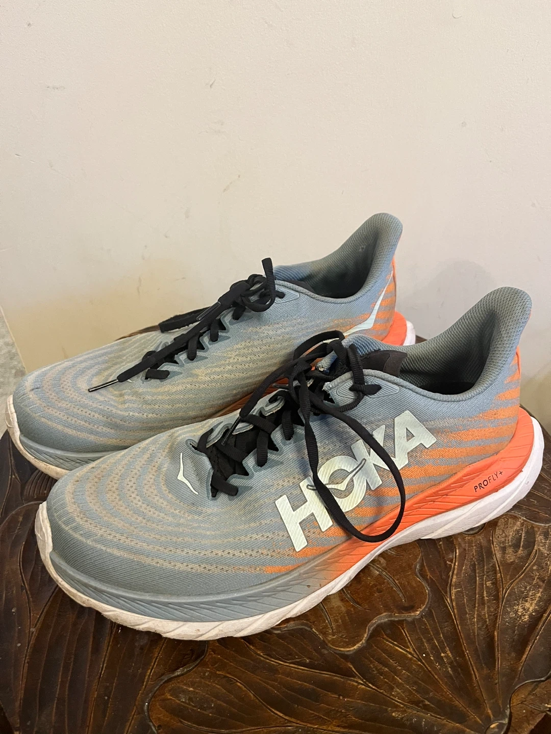 These are Hoka running shoes with a PROFLY+ midsole. They're lightweight and designed for comfort during your runs. Good for road running. Men’s 10.5