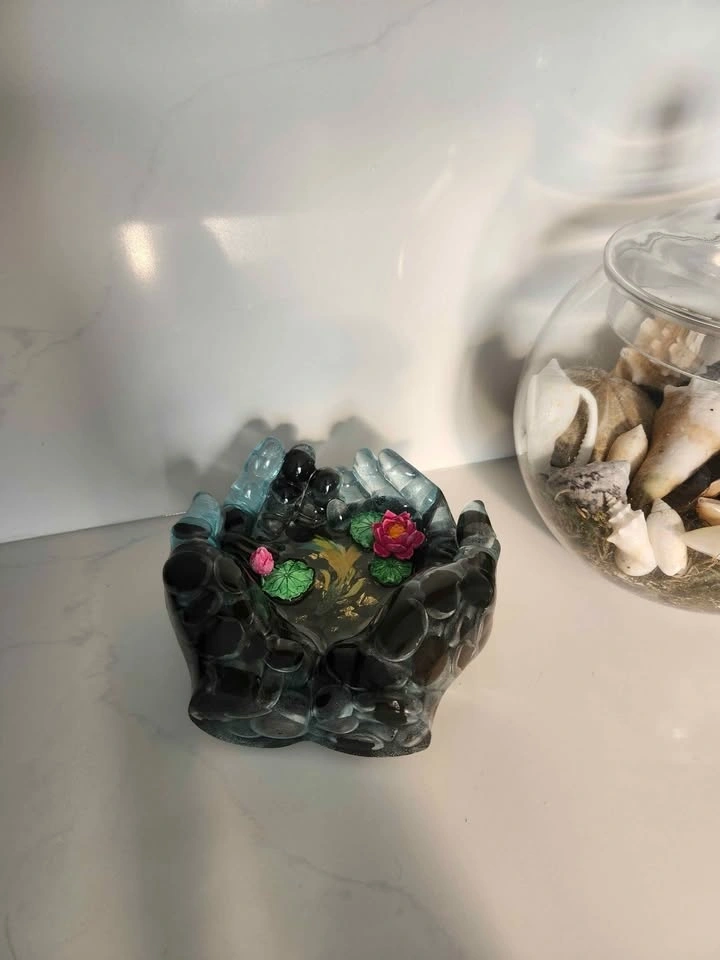 Hand crafted resin hands dish with hand painted beta, lotus flowers and lily pads.