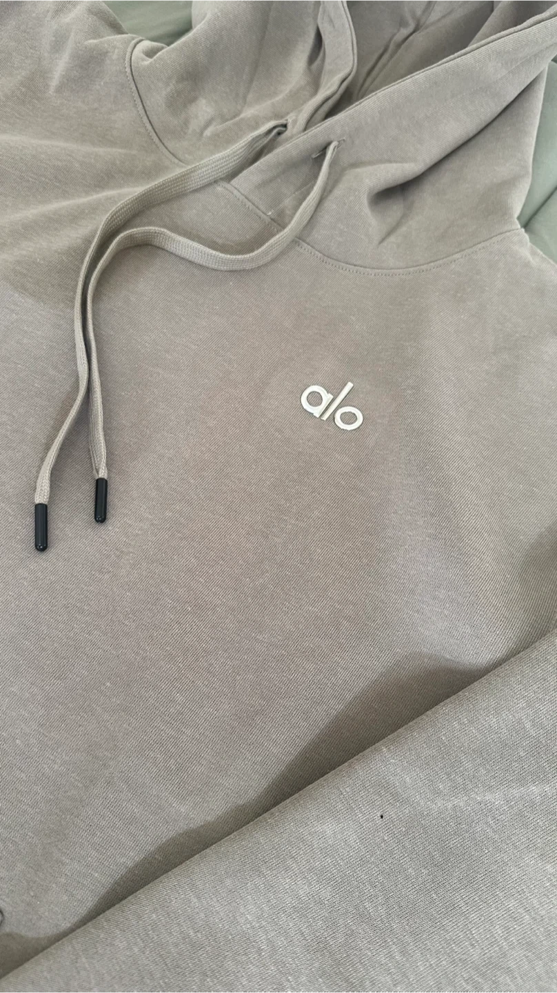 Selling a gently used ALO Yoga hoodie in size large. It's in great condition and super comfy! Perfect for workouts or just lounging around the house. The material is soft and cozy, making it a great addition to your wardrobe