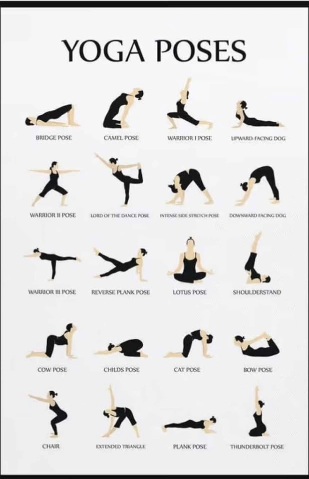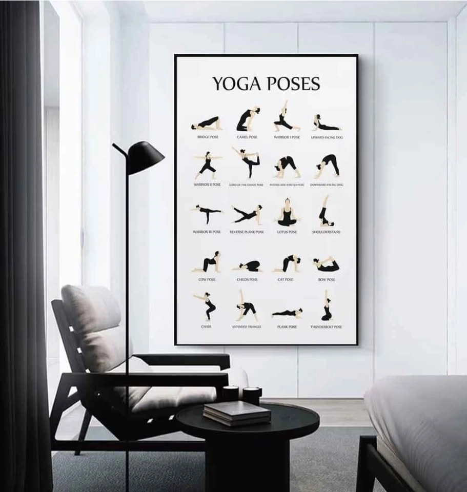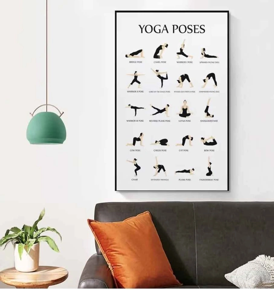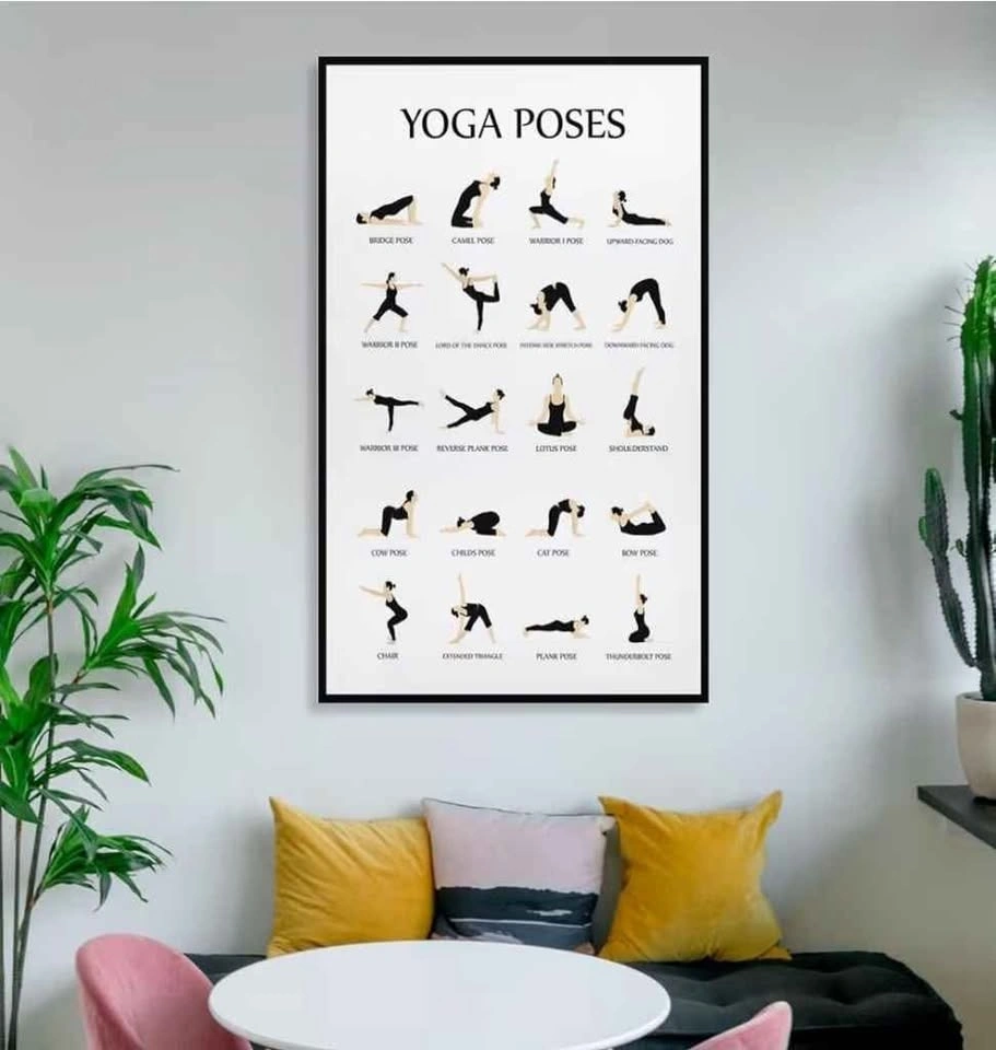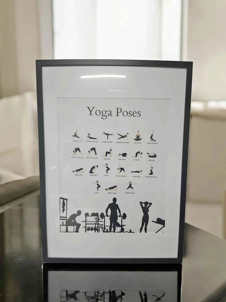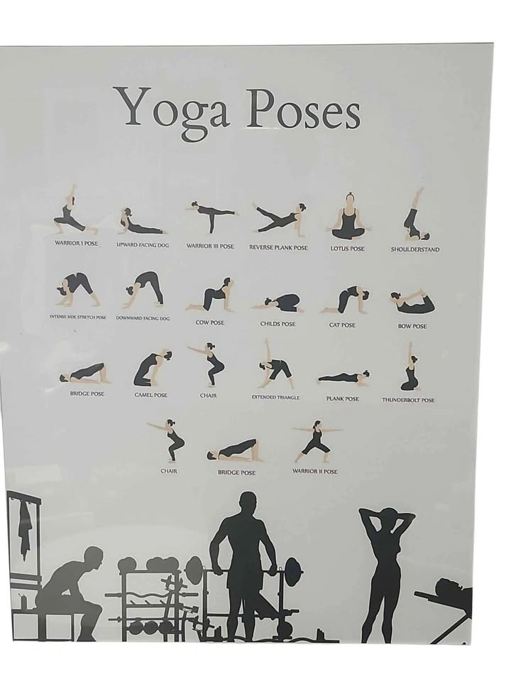 This is a framed poster of yoga poses and gym exercises. It is a reference chart that includes various yoga poses. These types of posters are designed to be used for home workout. The frame alone cost $25.