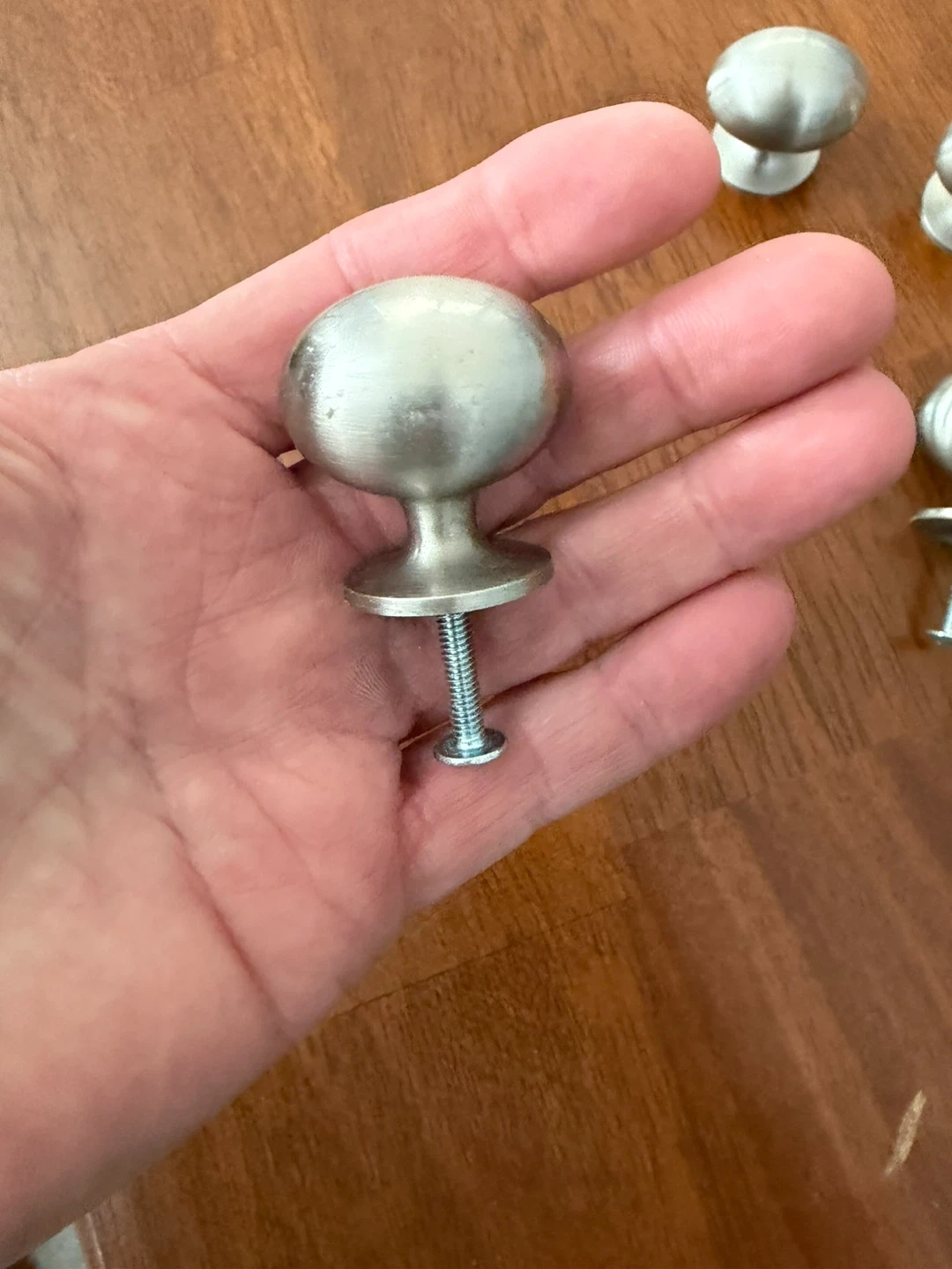30 round cabinet knobs with a brushed nickel finish. Each knob has a screw included for installation. These are great for updating dresser drawers or kitchen cabinets! Price is $10 each.