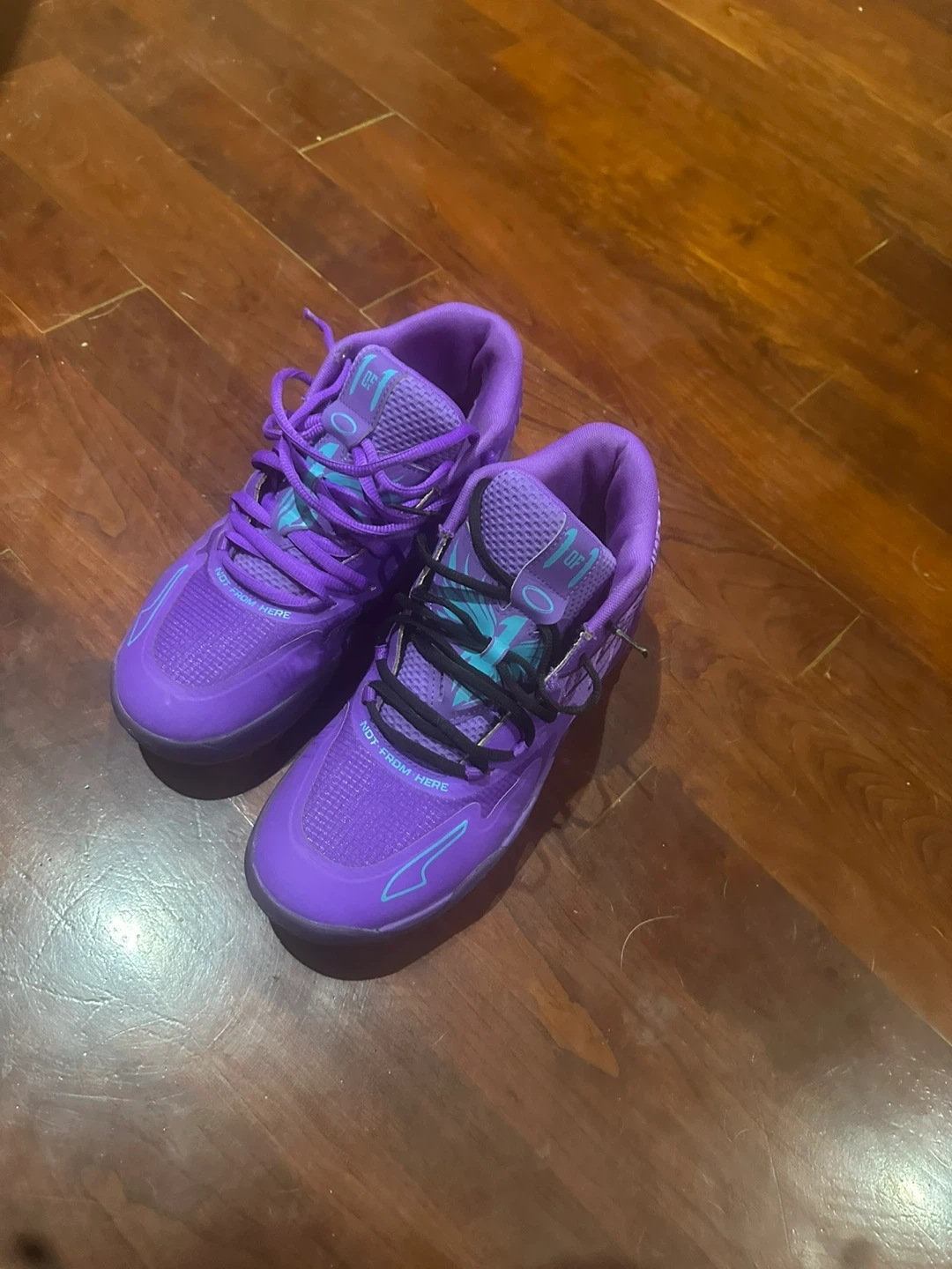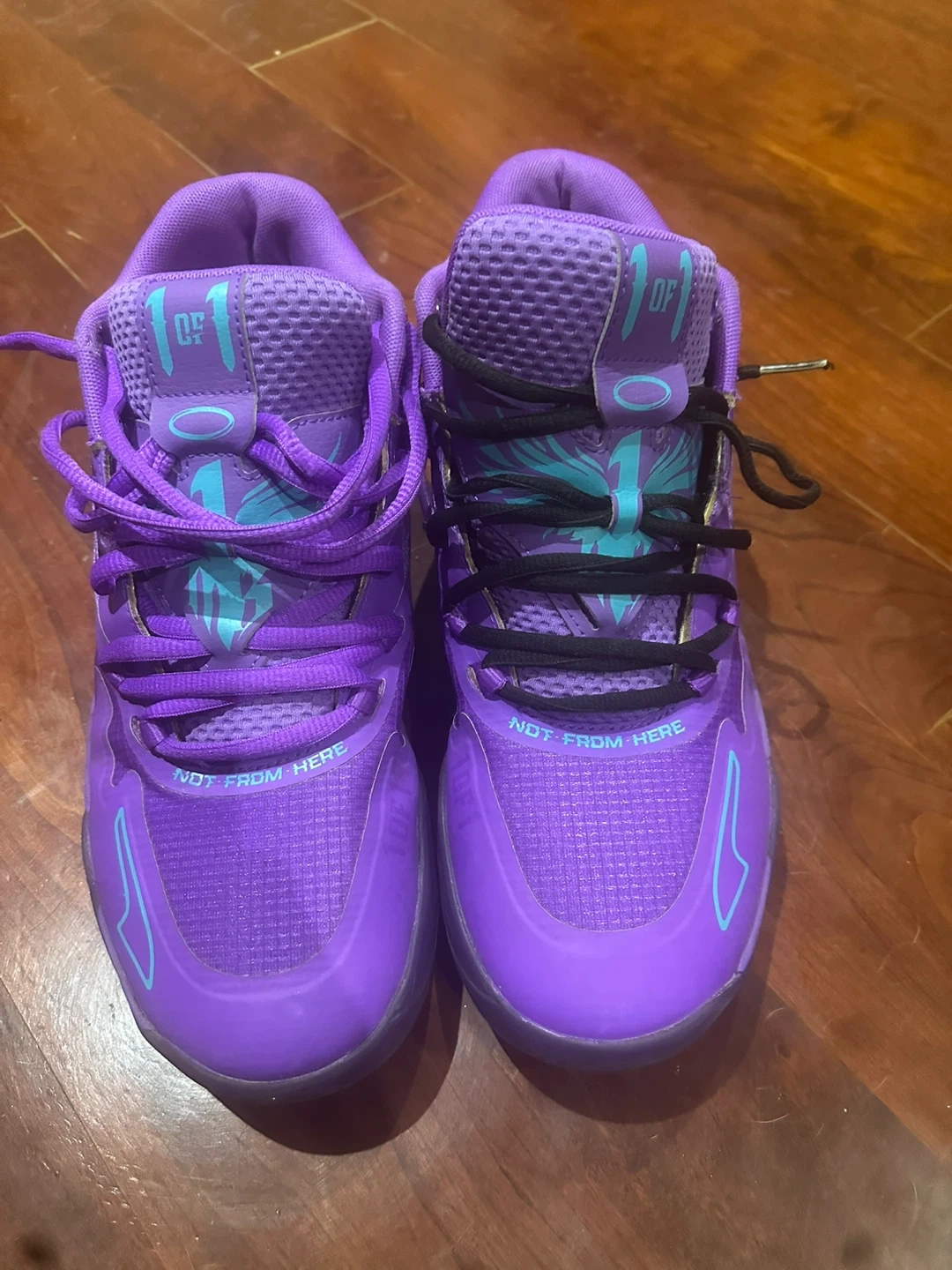 Selling a pair of Puma MB.01 Lo "Not From Here" basketball shoes in a vibrant purple colour! These are a US size 10. They have a unique design and are in great condition, perfect for on the court or just for everyday wear