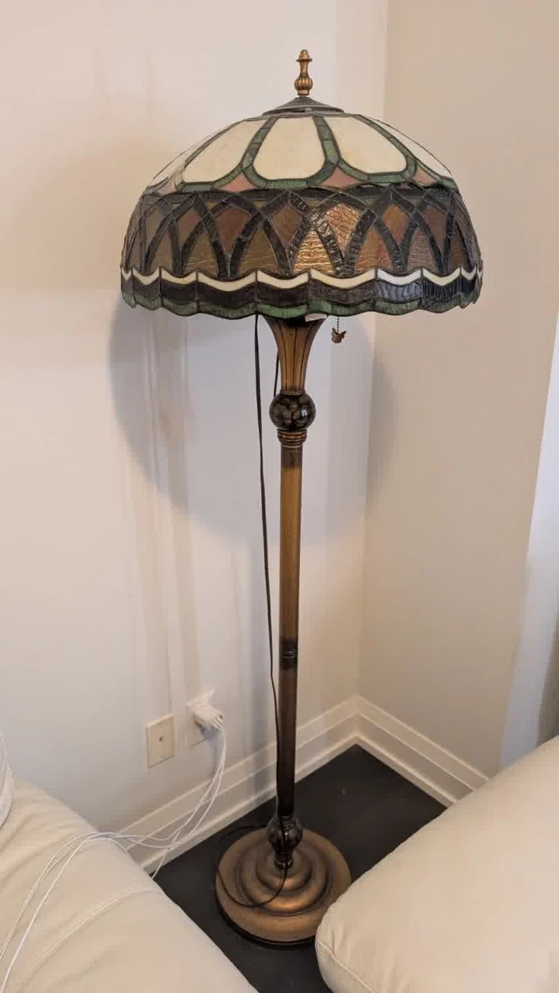 A beautiful Tiffany style stained glass floor lamp with a multicoloured dome shade. It features a dark wood-finish pole and a sturdy round base. This lamp adds a warm and inviting glow to any room.