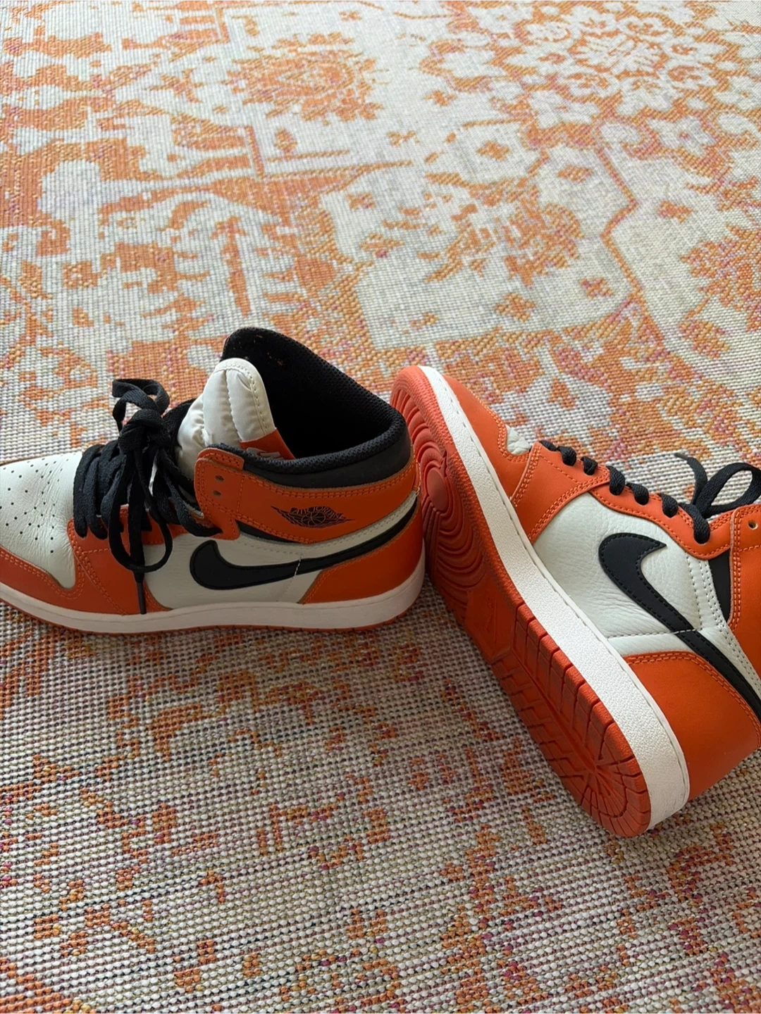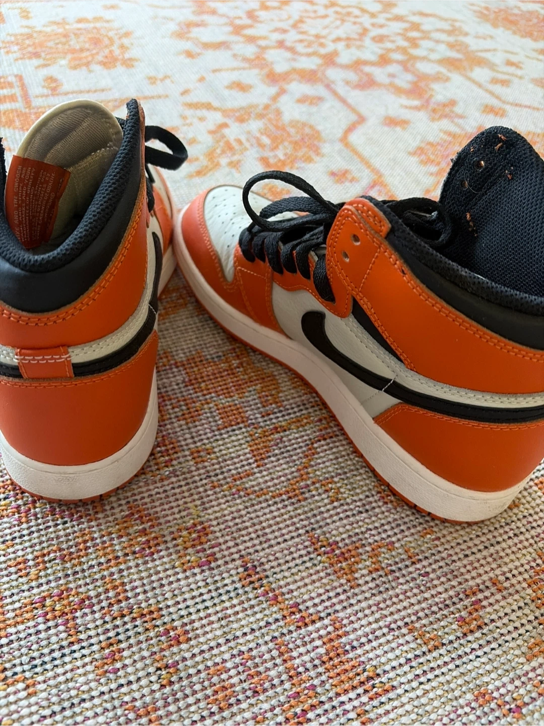 Iconic Air Jordan 1 High OG sneakers in the "Shattered Backboard" colorway. Features a combination of premium leather with orange, white, and black accents. These high-top sneakers include the classic Nike Air cushioning for comfort. A must-have for any sneaker enthusiast's collection!