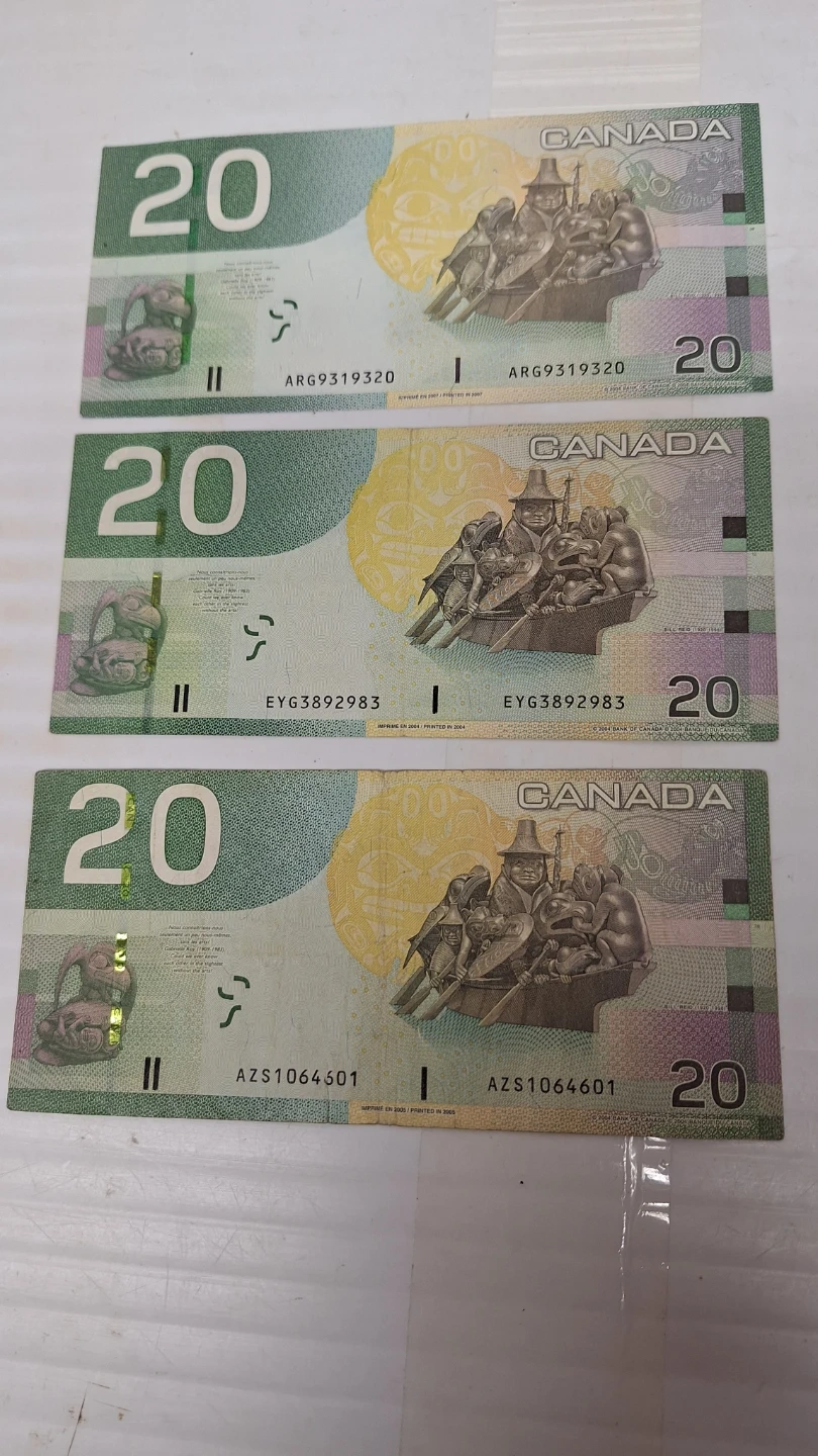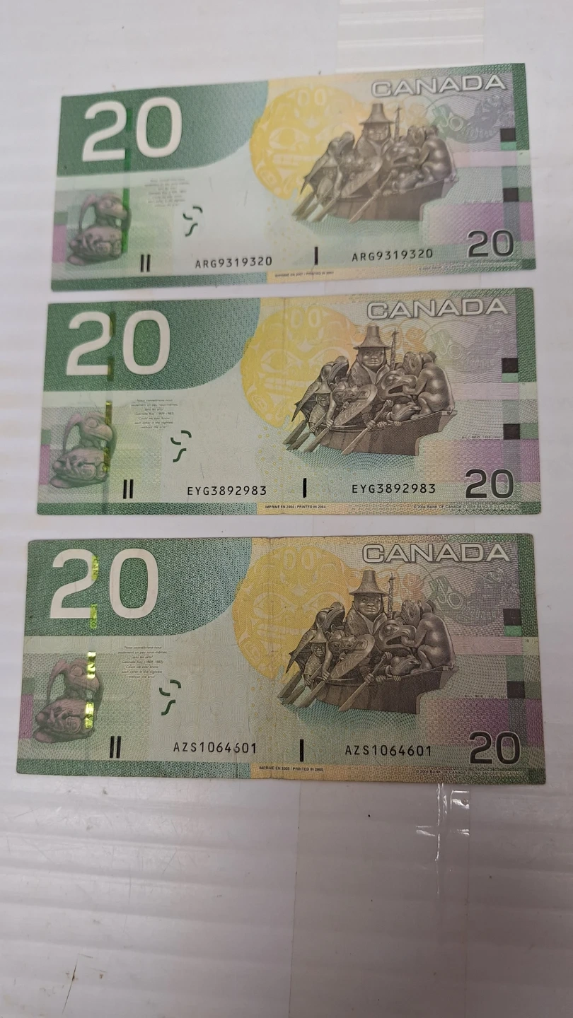 Three genuine Canadian twenty-dollar banknotes ( with special numbers). Features the portrait of Queen Elizabeth II and the Canadian Coast Guard icebreaker.