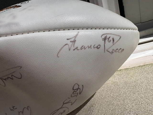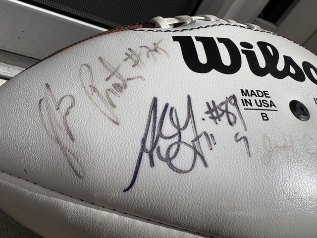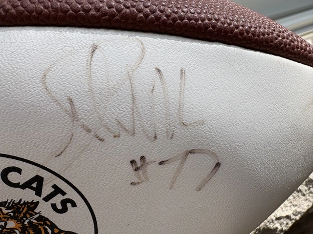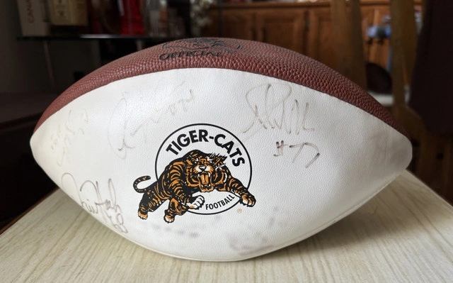 Own a piece of Canadian football history with this 1999 Hamilton Tiger-Cats SIGNED football from their Grey Cup Championship year. This unique collectible features signatures from some members of the team. A few signatures are faded, but it's a great item for any diehard Ticats fan or sports memorabilia collector. Pickup only in Burlington (Pinedale). Price is firm. OSKEE WEE WEE.