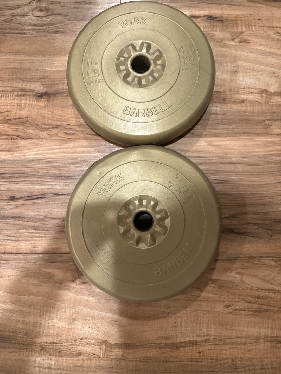 Selling a pair of York barbell weight plates. Each plate weighs approximately 10 lbs (4.5 kg). They are in good condition and ready for your home gym!