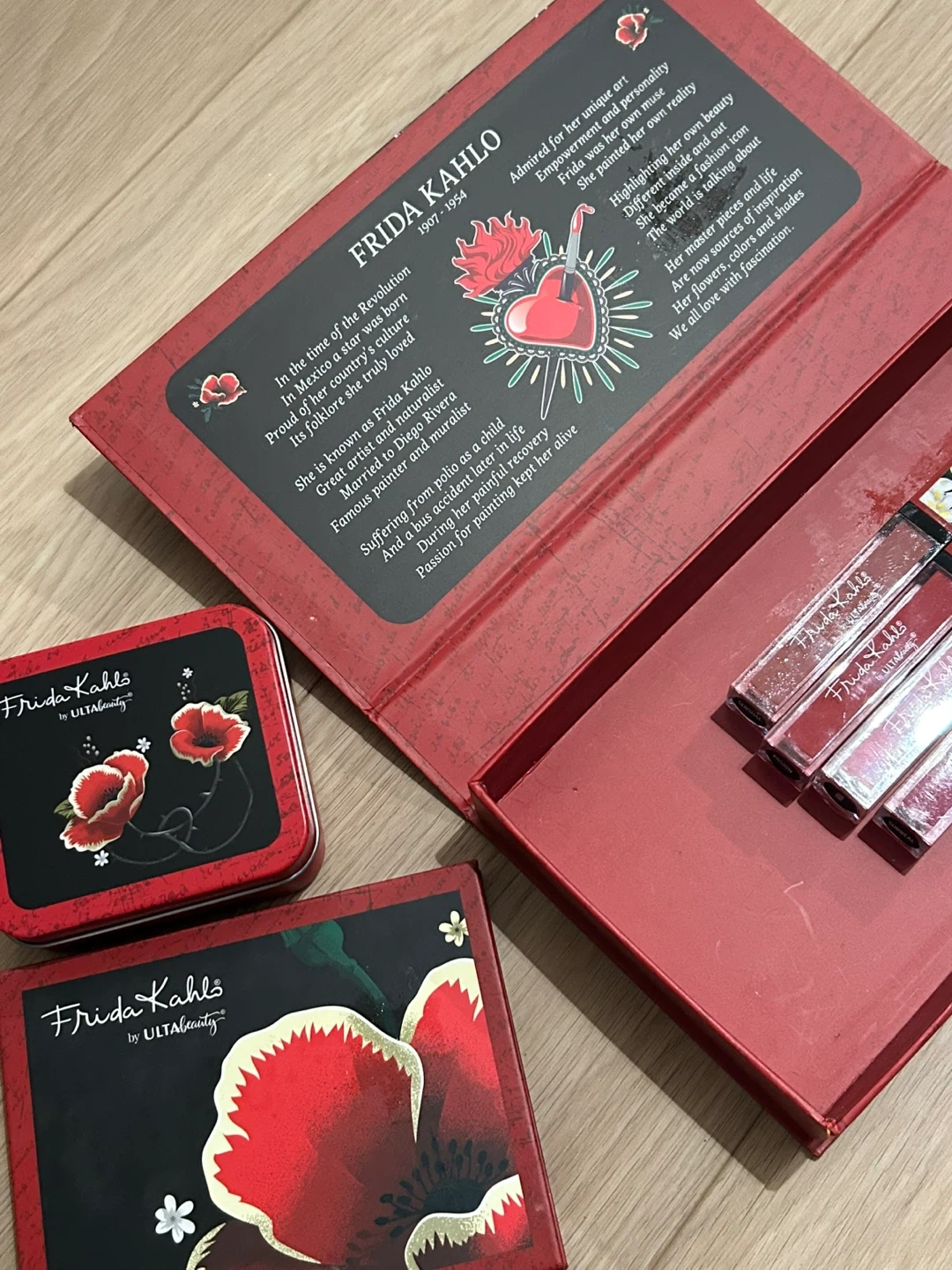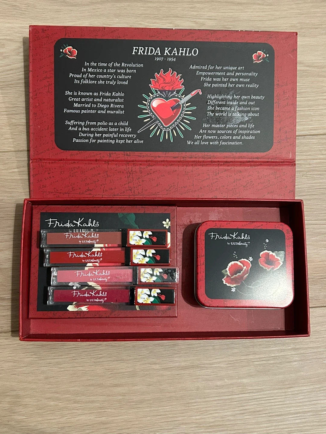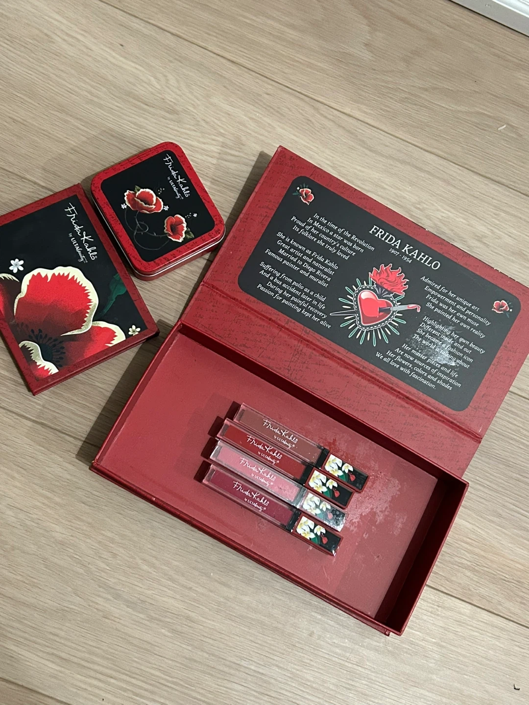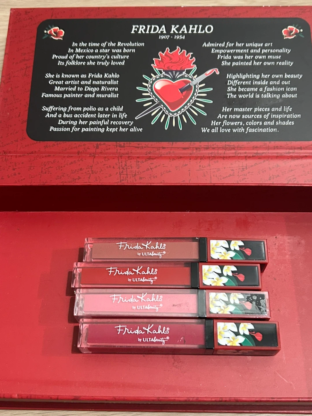 This is a Frida Kahlo by Ulta Beauty lipstick set. It includes four liquid lipsticks in various shades. The set also comes with a makeup brush cleaner & a full 12-pc eyeshadow palette.