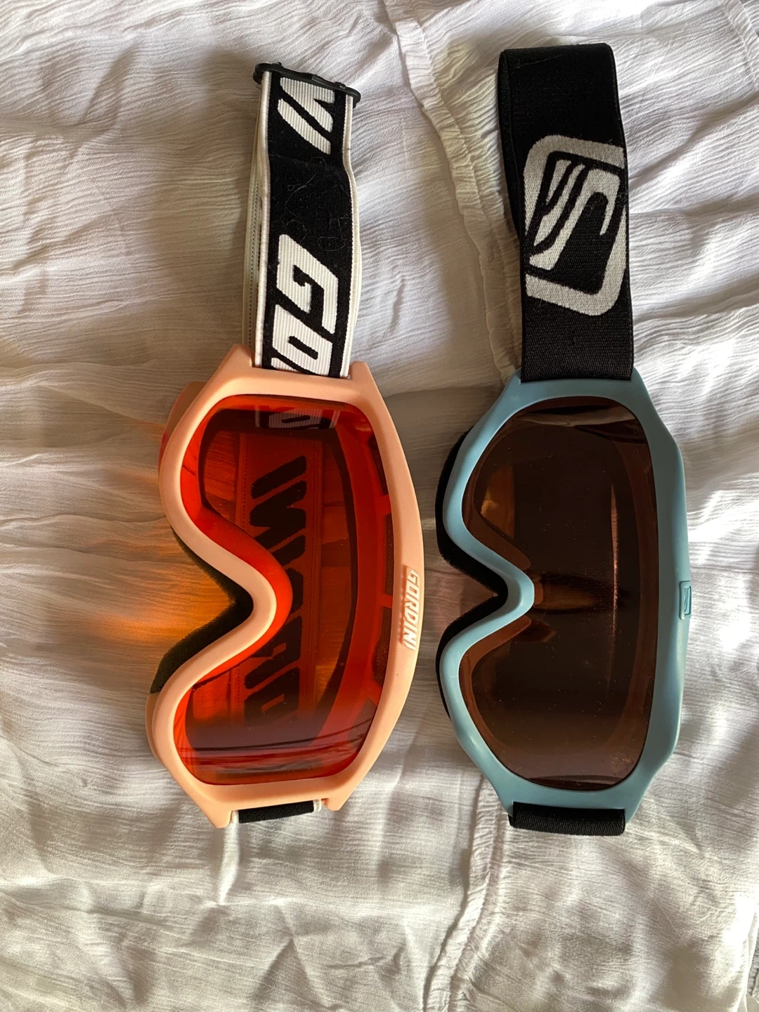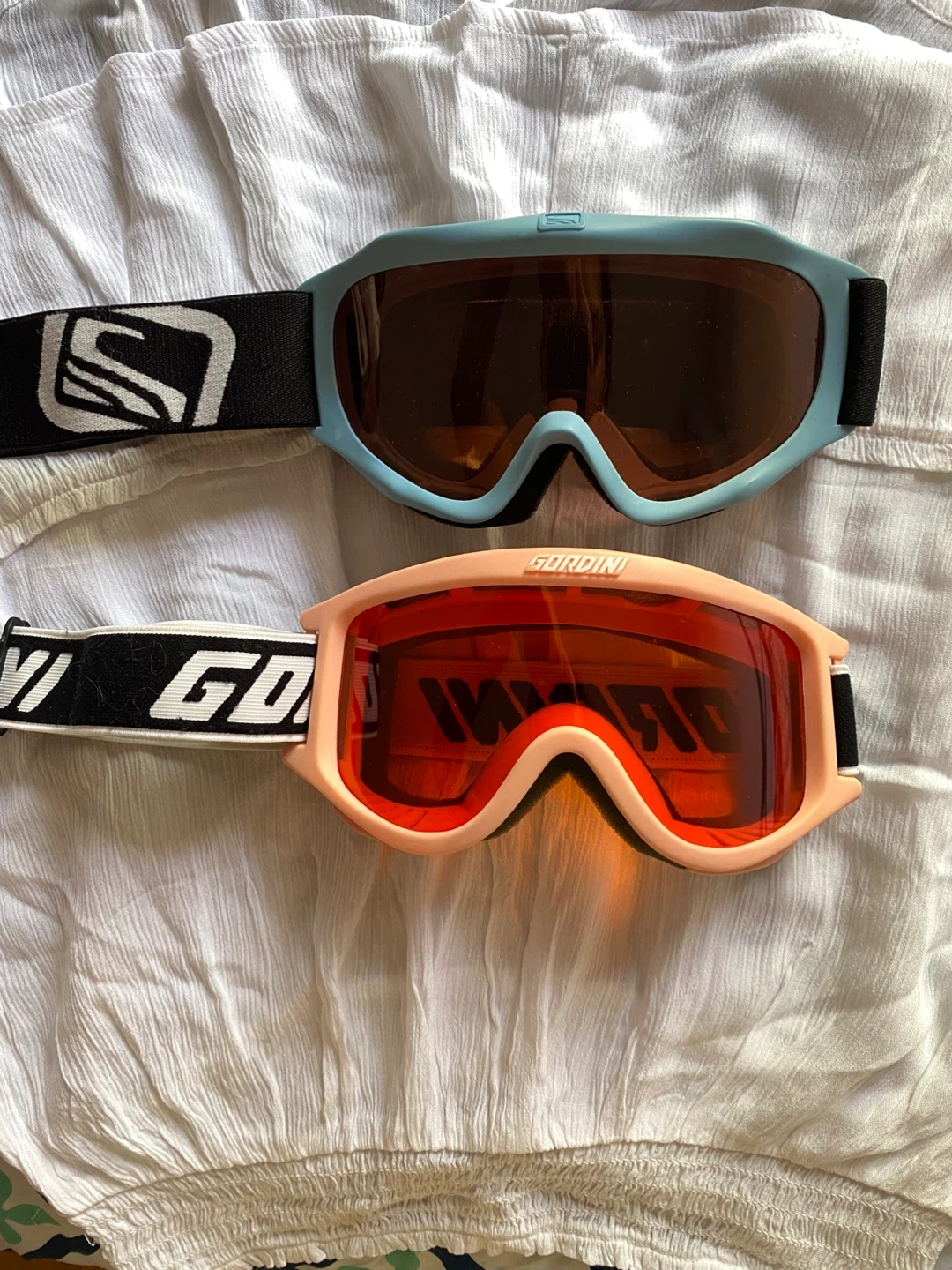 Two pairs of Gordini ski goggles for sale! One pair is light blue and the other is peach pink. Both for $25 or each for $15