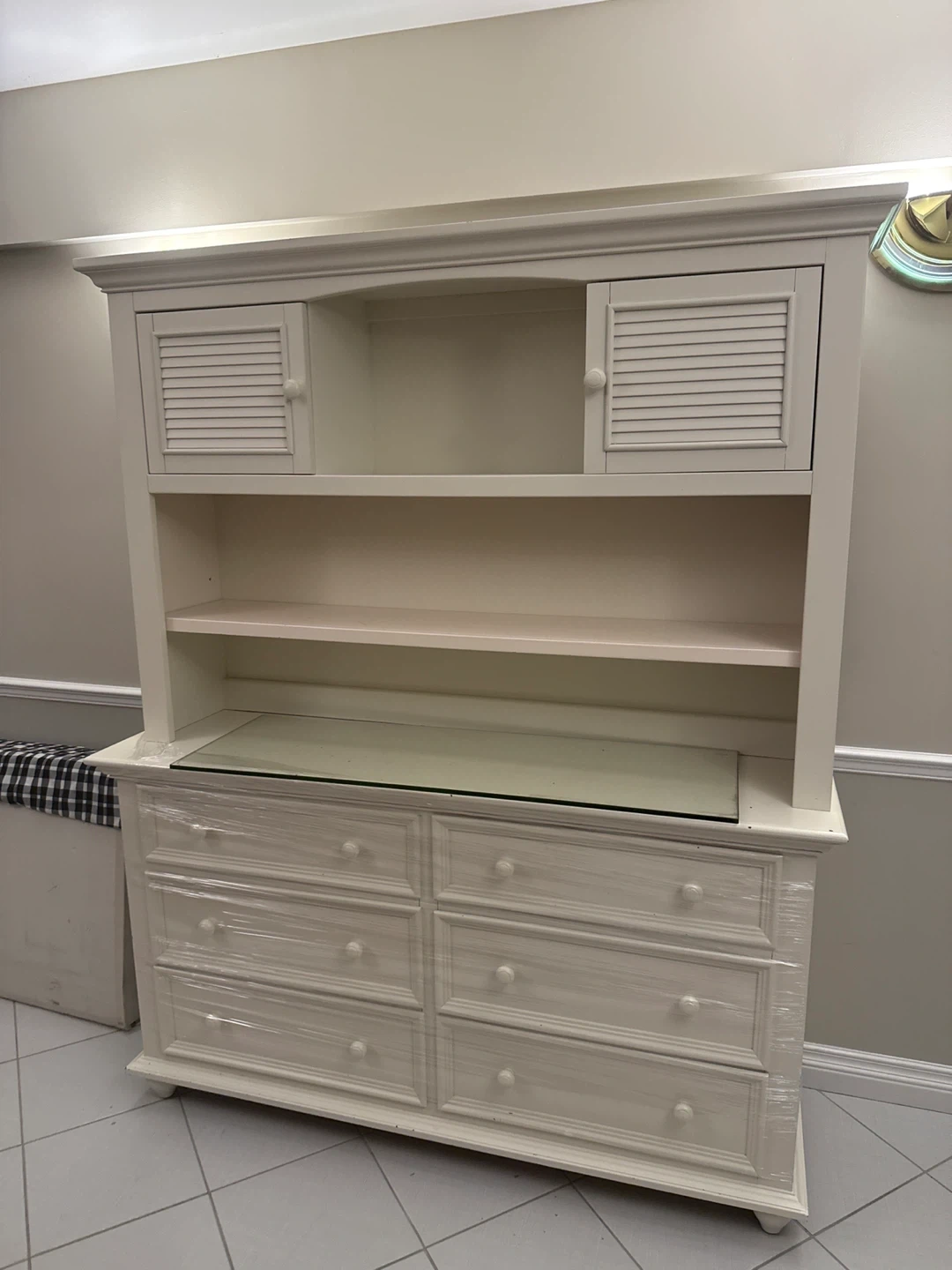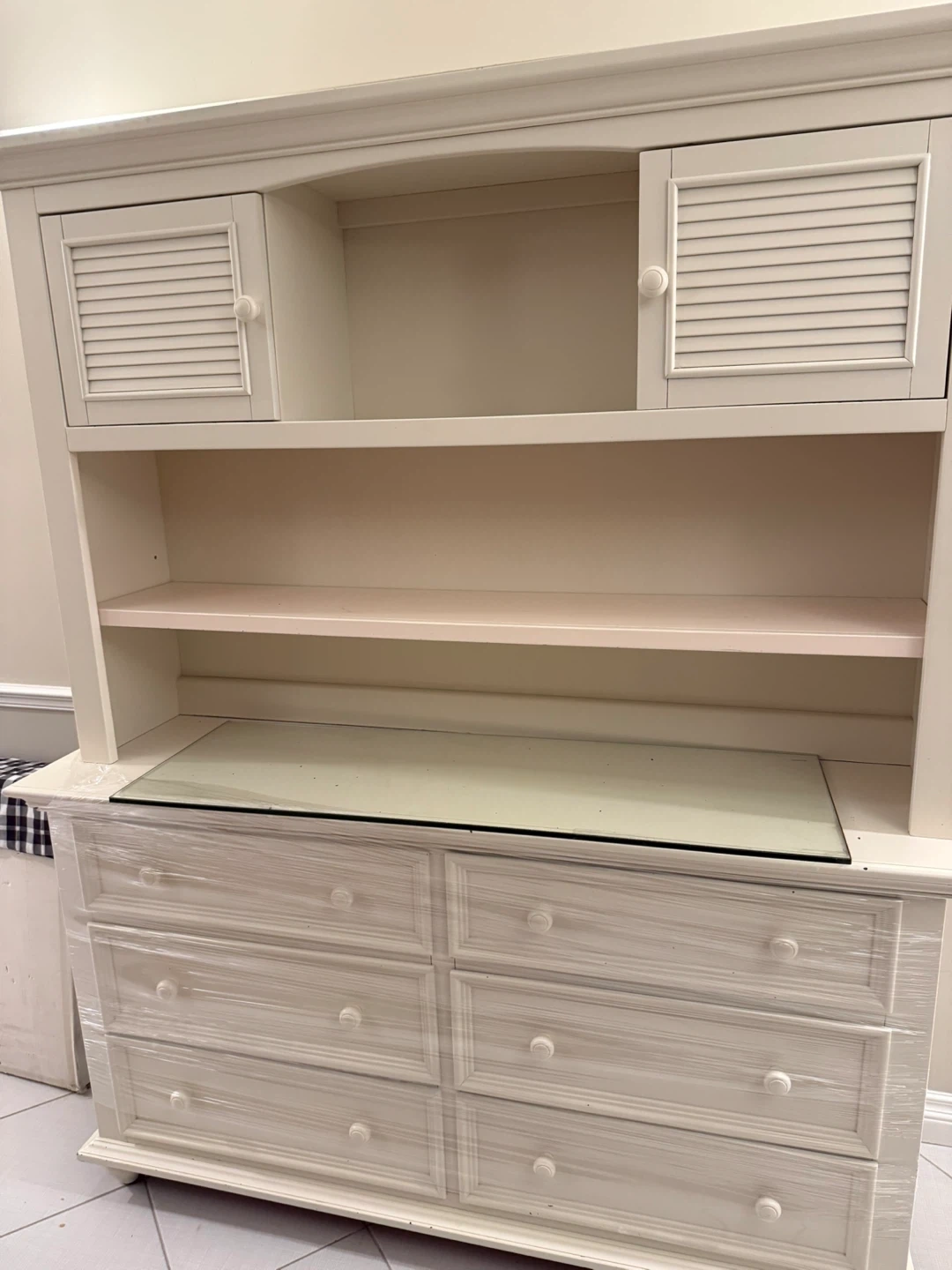 Selling a wardrobe and dresser set in good condition. The set includes a wardrobe with drawers and a dresser with a hutch. Both pieces are wrapped in plastic for protection during transport.