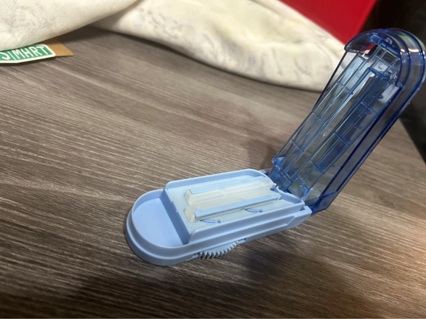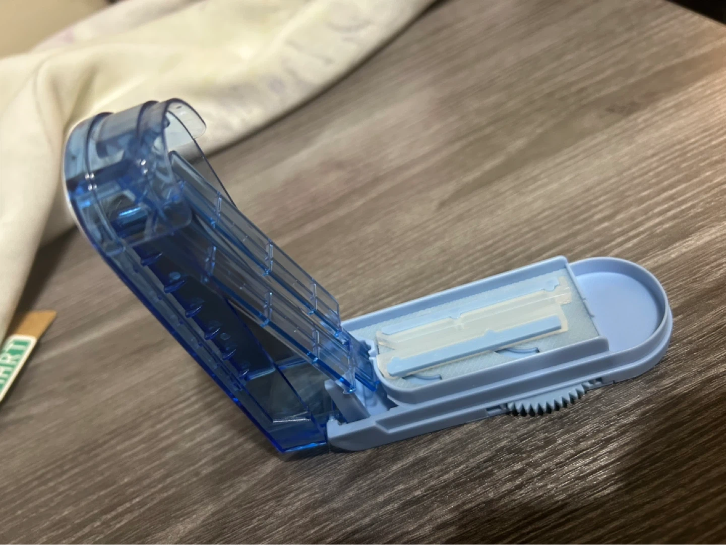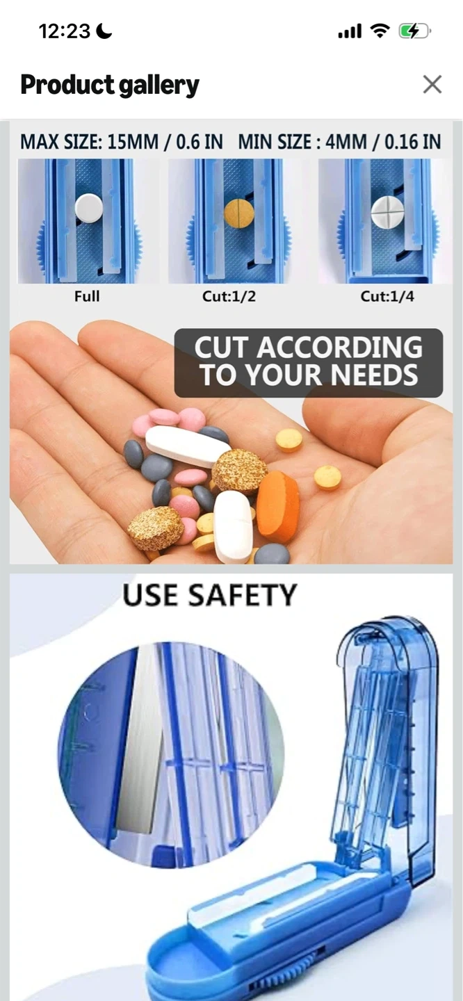 This new pill cutter features a transparent blue plastic design. It's suitable for cutting pills up to 15mm in size. You can cut pills into full, half, or quarter pieces.