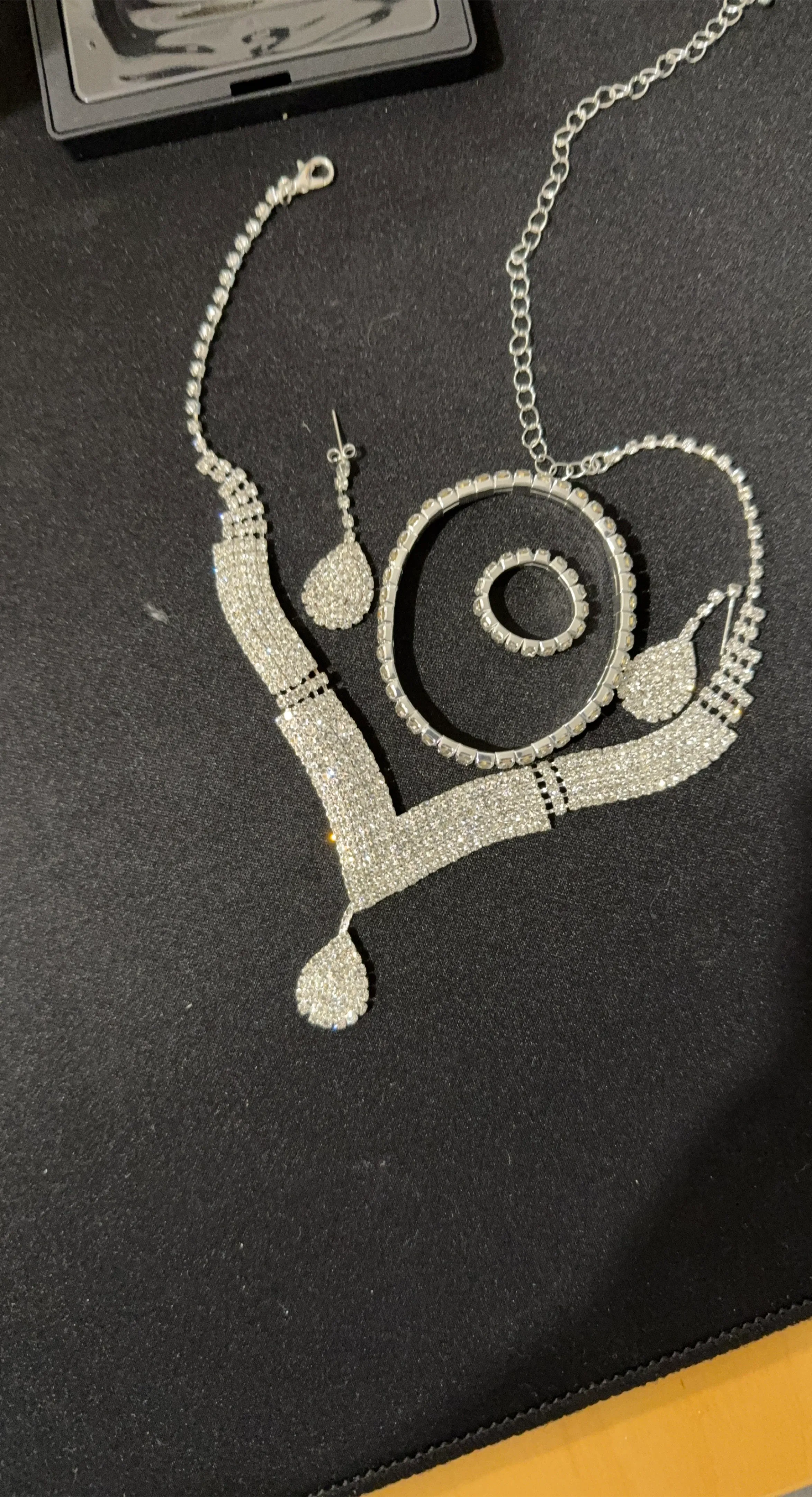 Selling a beautiful silver rhinestone jewellery set! This includes a necklace, a ring, and a pair of earrings. Perfect for adding a touch of sparkle to any outfit!