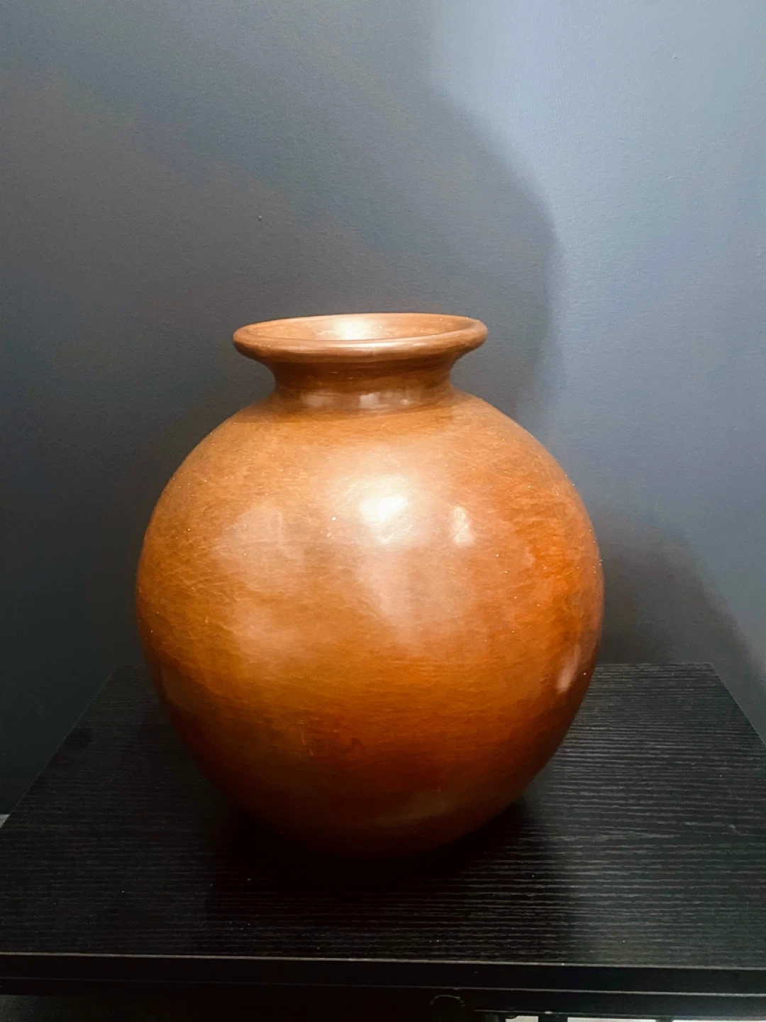Large terracotta vase with a smooth finish. Its rounded shape and warm, earthy tone make it a beautiful decorative piece. It's perfect for adding a touch of rustic charm to any room.
