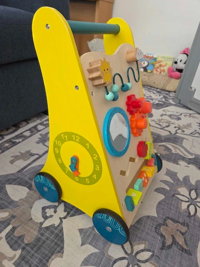 Beautifully crafted wooden baby walker with many Montessori busy board activities. Colorful and sturdy with a basket in the back. Wheels can be easily removed to just use as an upright busy board before baby starts standing or walking. Pick up near Martin Grove and Bloor. Open to offers.