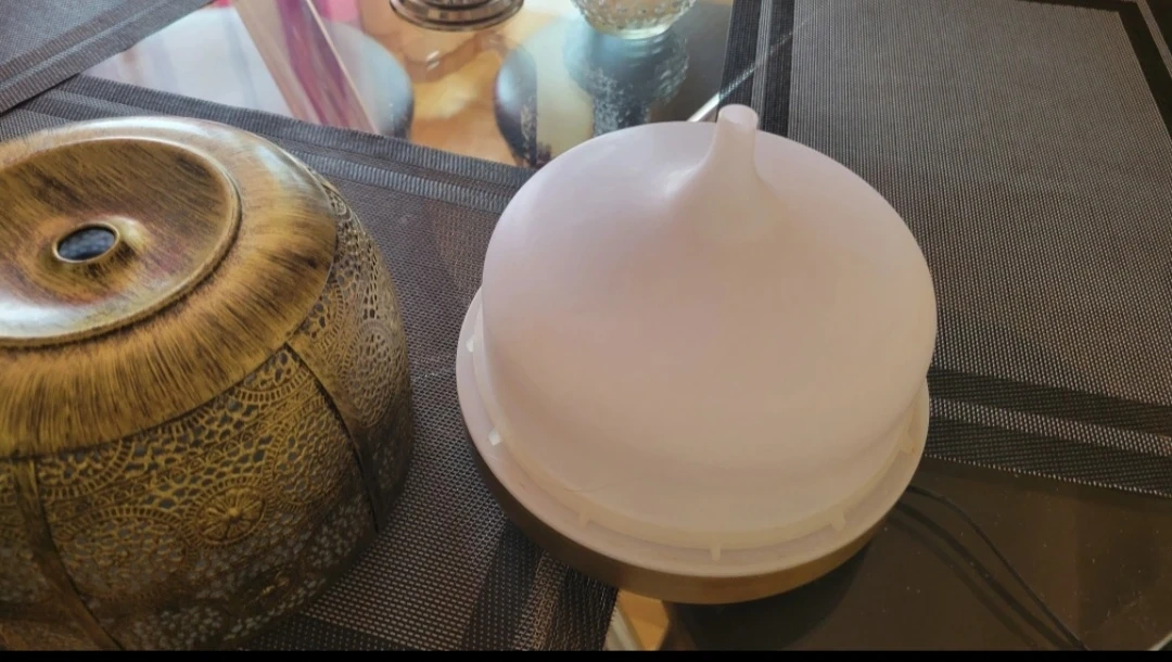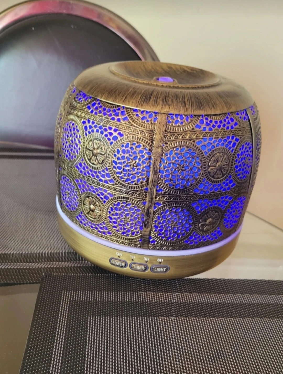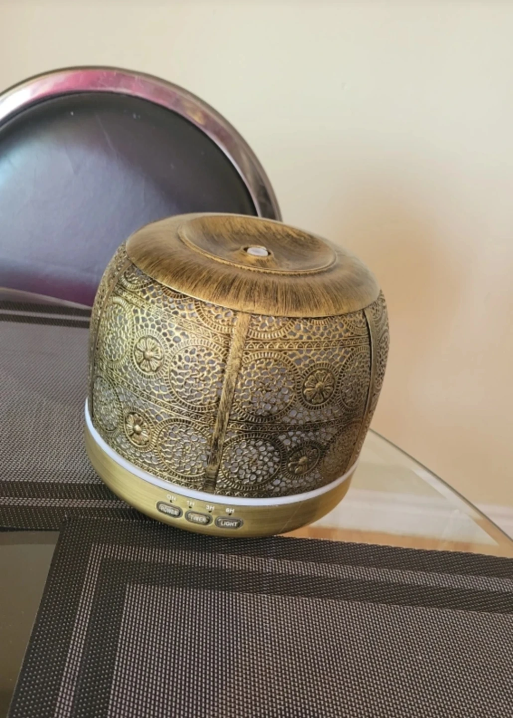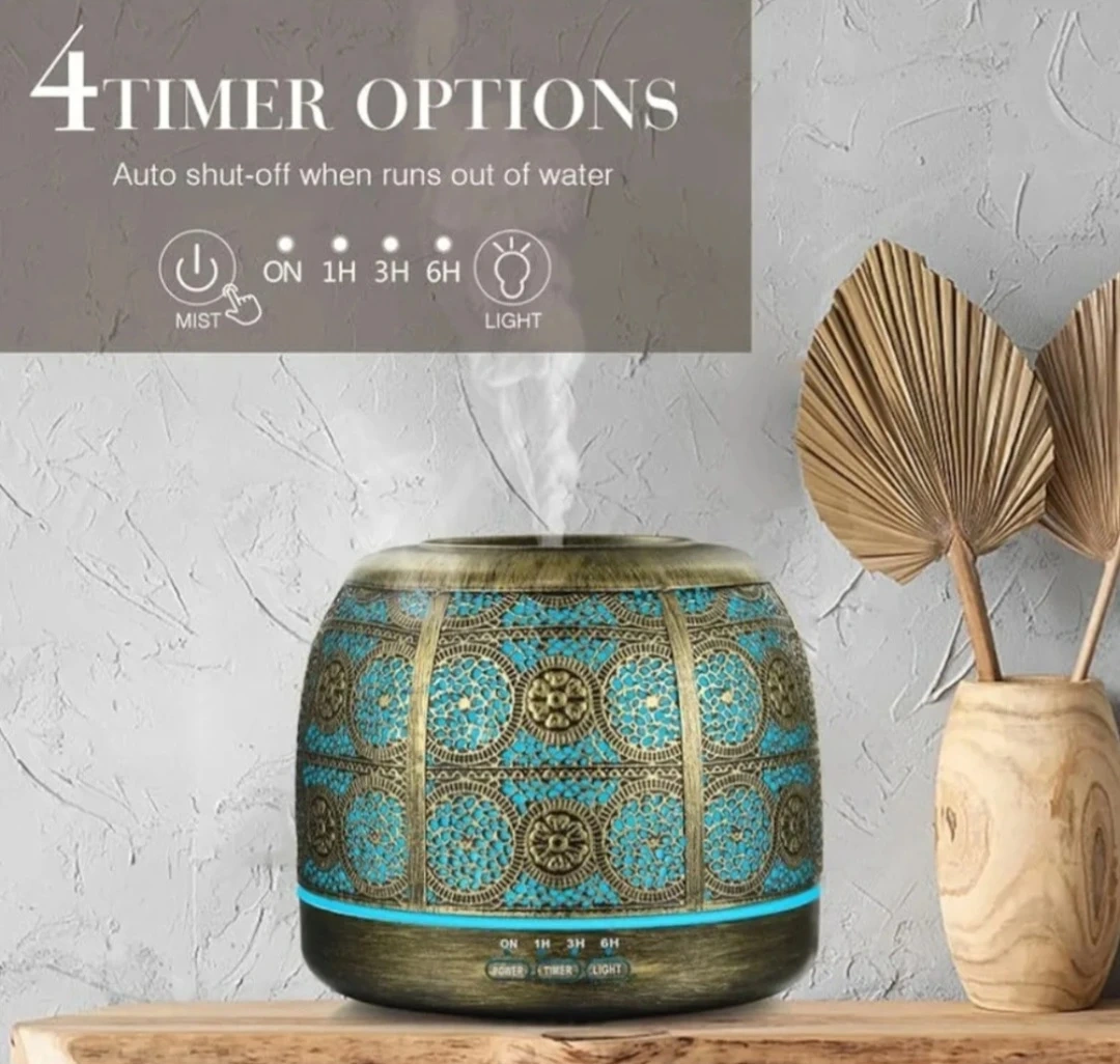 This decorative essential oil diffuser features a unique, ornate design with intricate patterns. It includes four timer options and automatically shuts off when the water runs out. The diffuser also has an ambient light function with multiple colour options.
