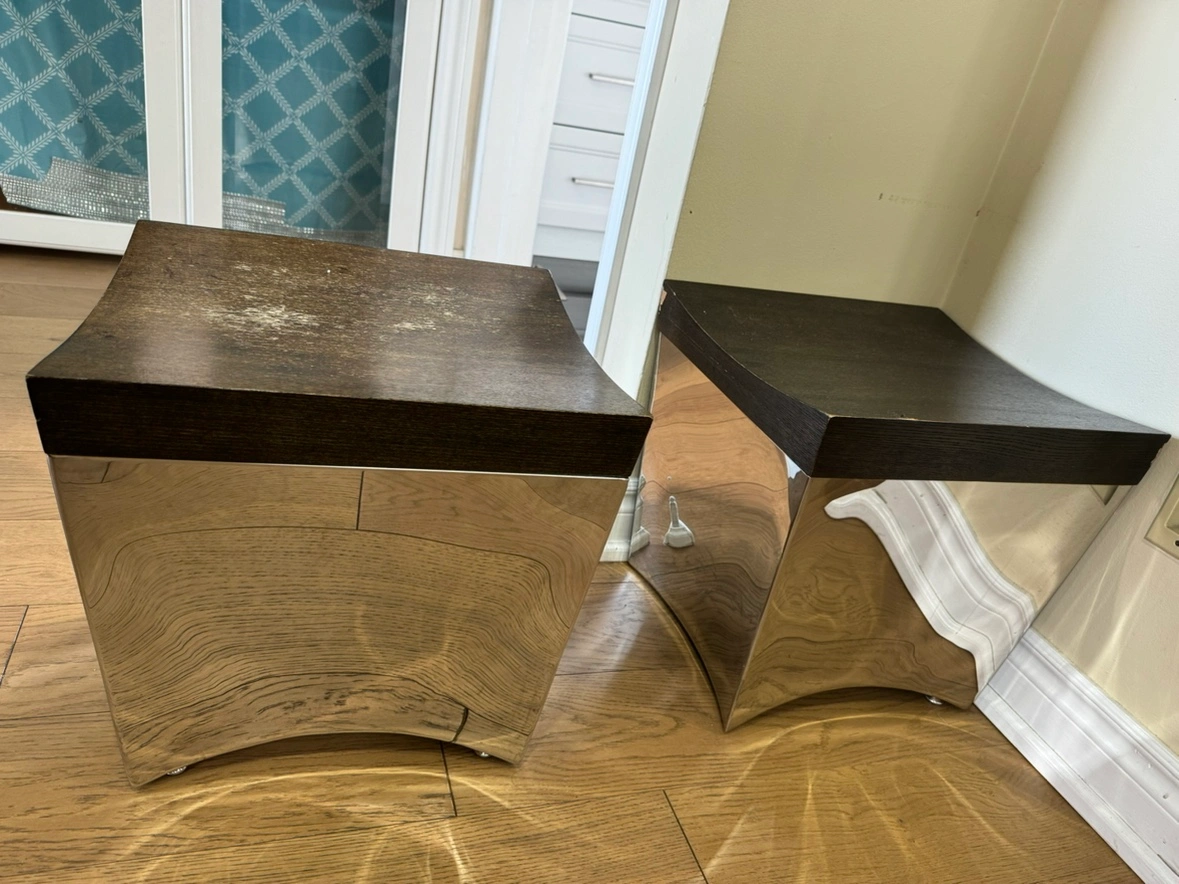 Two chrome and wood stools with a curved, square design. Each stool features a dark wood top. Great for a living room or bedroom. Price for both stools.