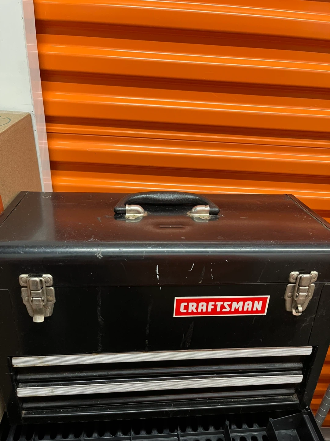This is a Craftsman tool chest, perfect for organizing your tools. It's black metal with three drawers and a sturdy handle. Includes a tray insert in the bottom compartment. Used in very good