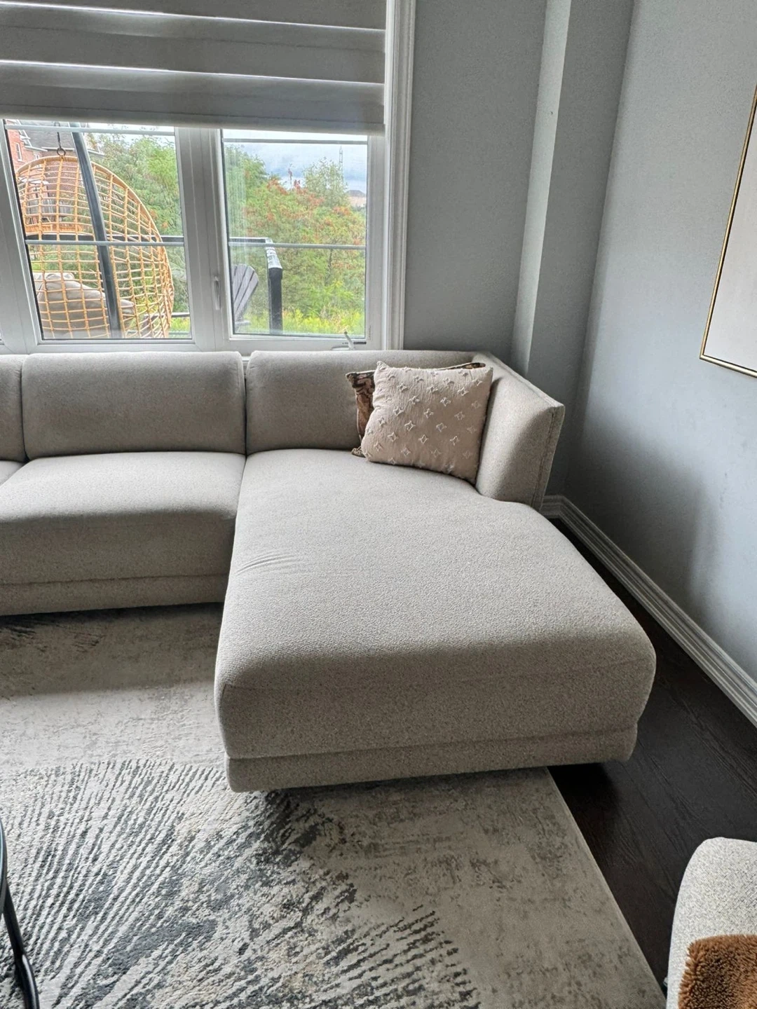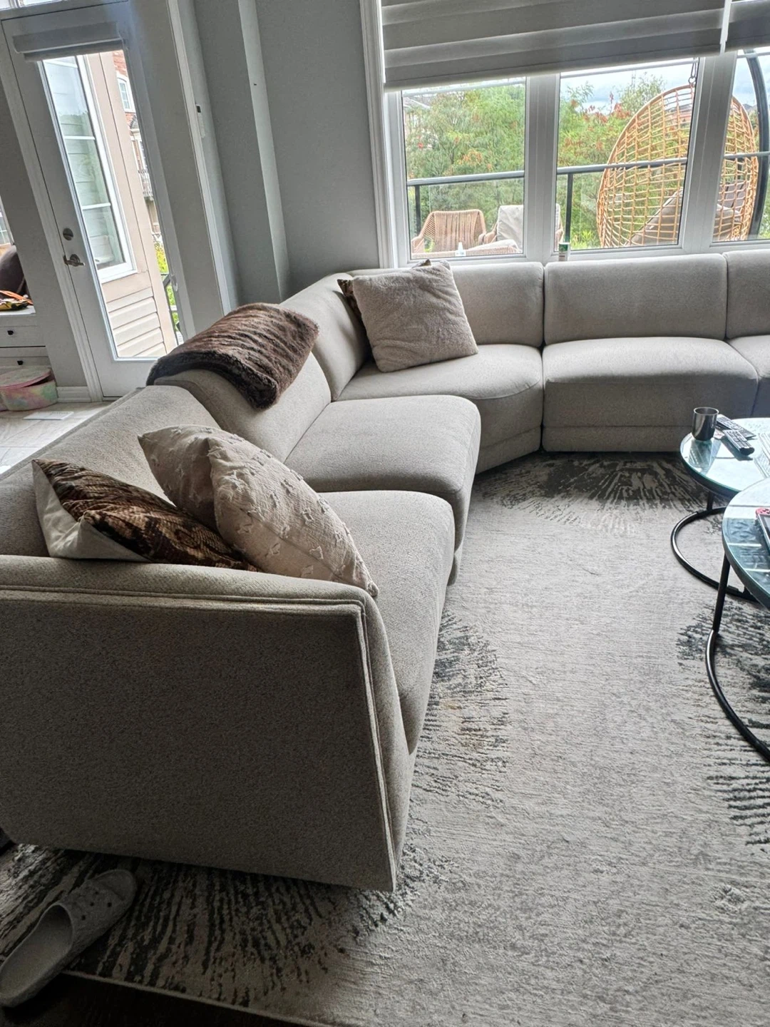 Spacious U-shaped sectional sofa in a neutral beige fabric. It's perfect for seating a large family or for entertaining guests. Comfortable and stylish addition to any living room!