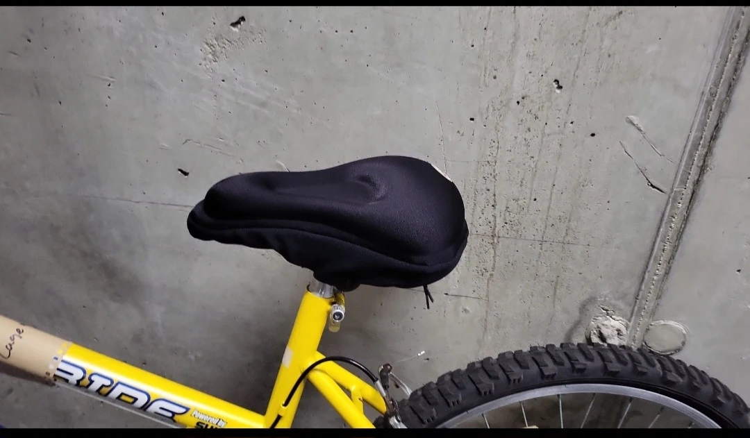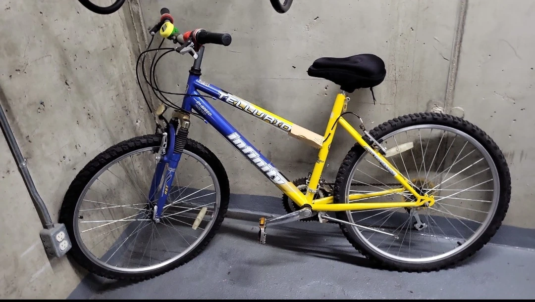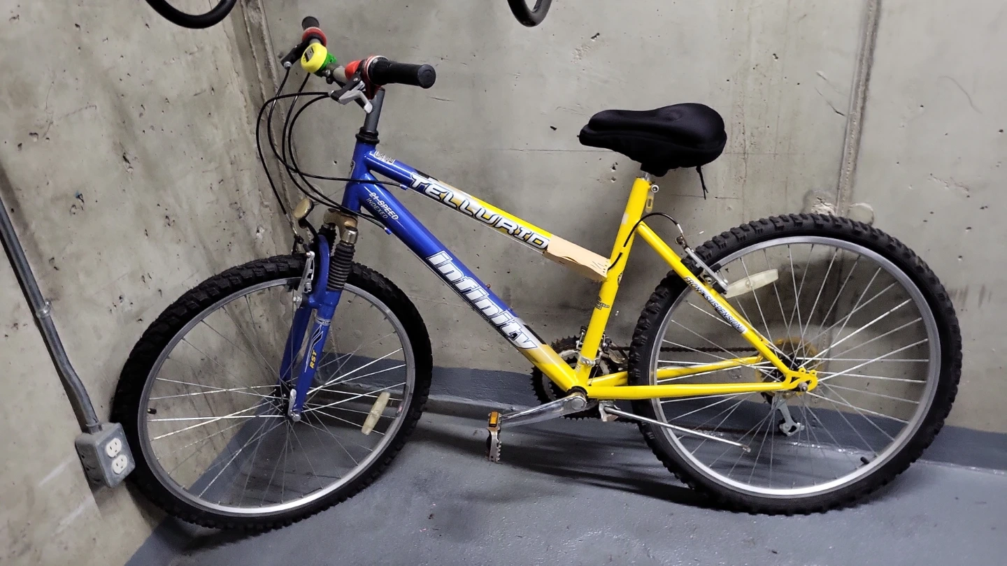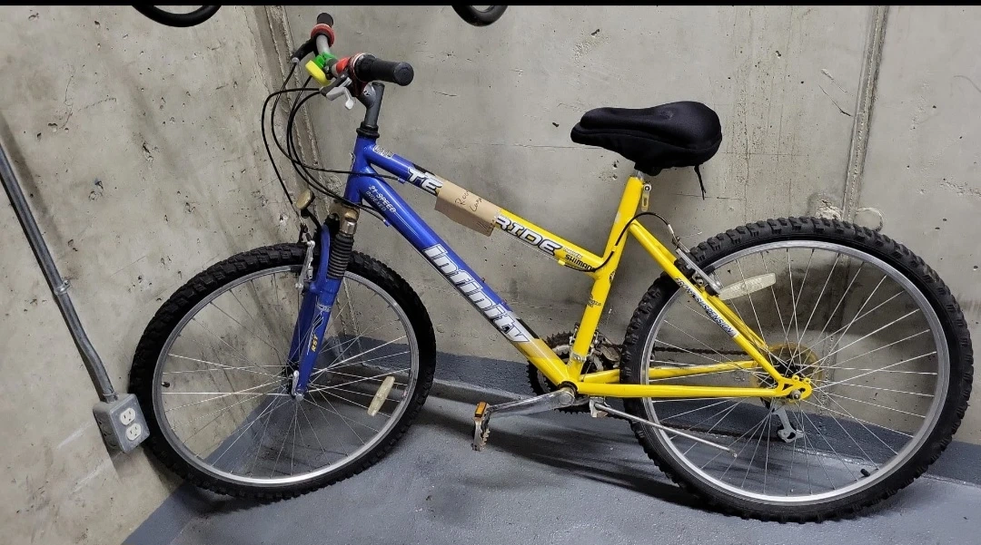 Blue and yellow Infinity Ride mountain bike with knobby tires. It has front suspension and a comfortable black seat cover. This bike's got a classic look for cruising around town or hitting light trails!