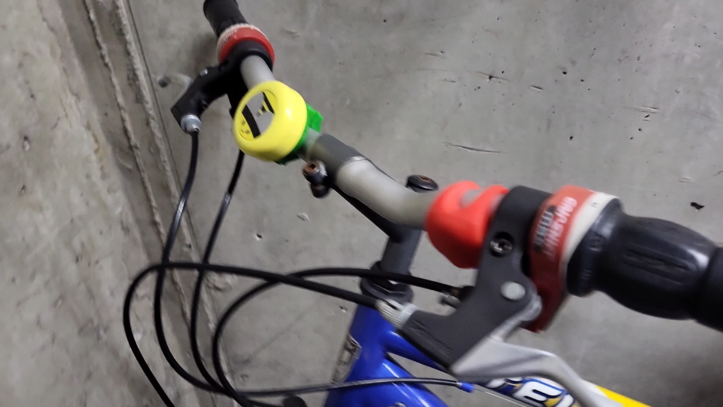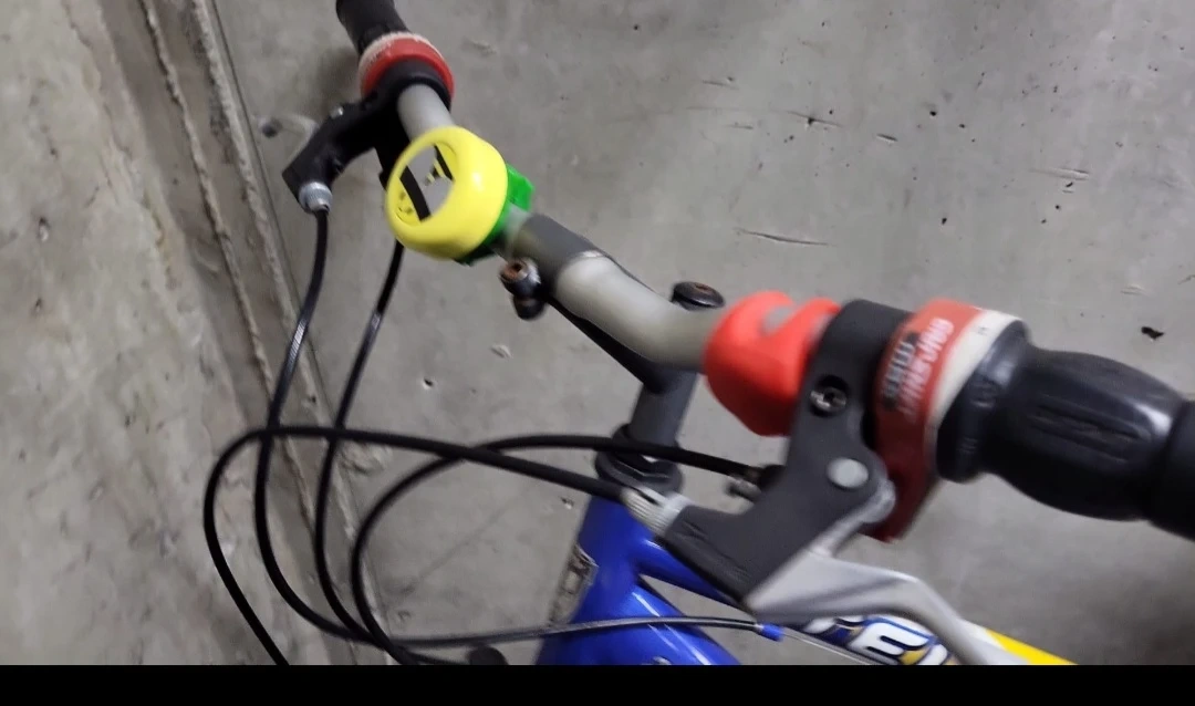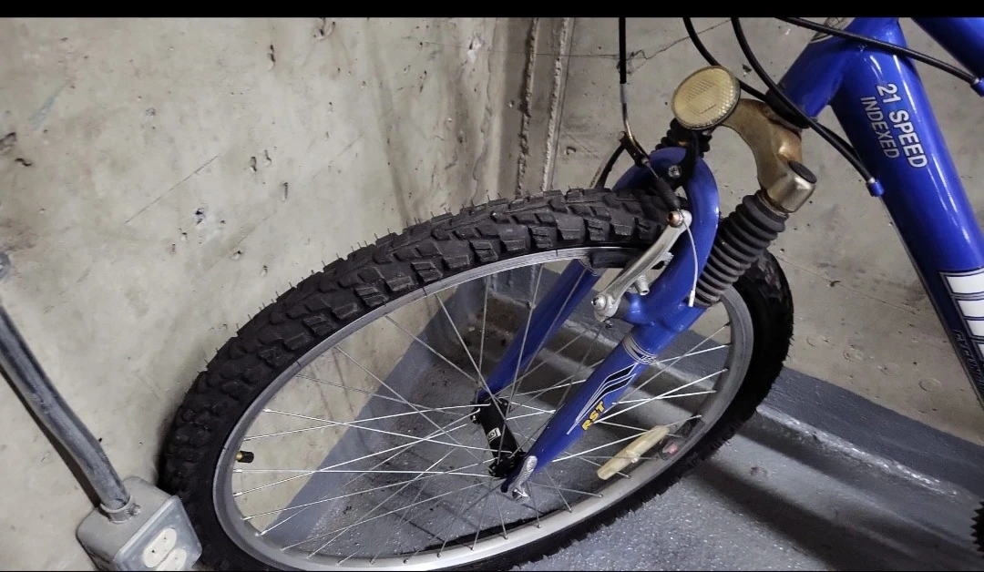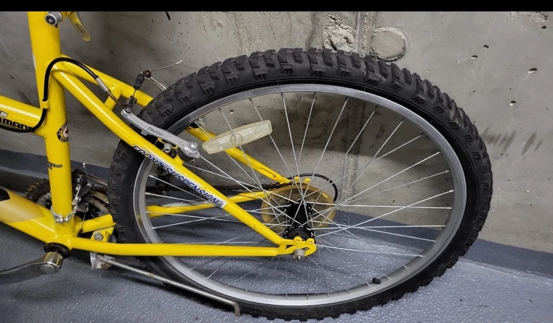 Blue and yellow Infinity Ride mountain bike with knobby tires. It has front suspension and a comfortable black seat cover. This bike's got a classic look for cruising around town or hitting light trails!