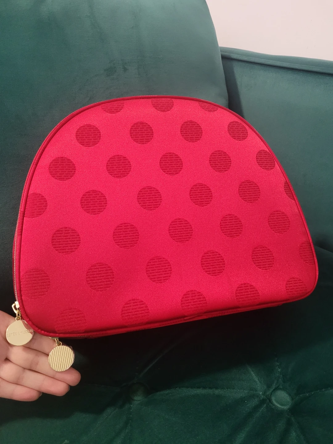 This is a bright red makeup bag from Estée Lauder. It features a fun polka dot pattern and a zippered closure. It's great for organizing your cosmetics!