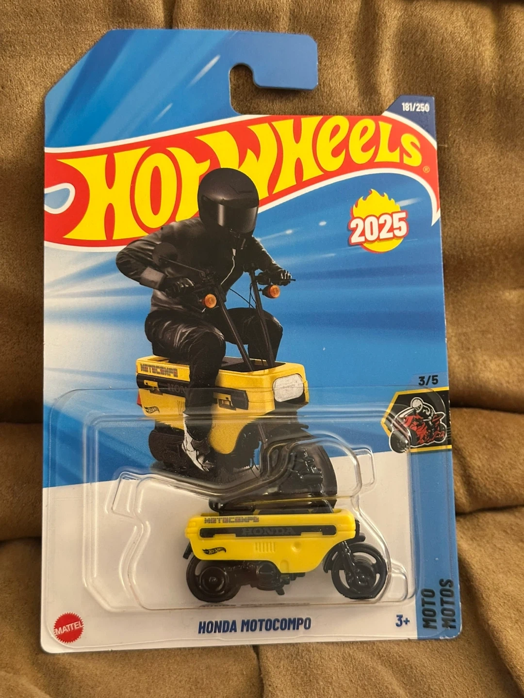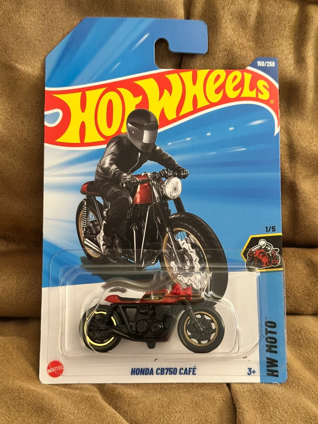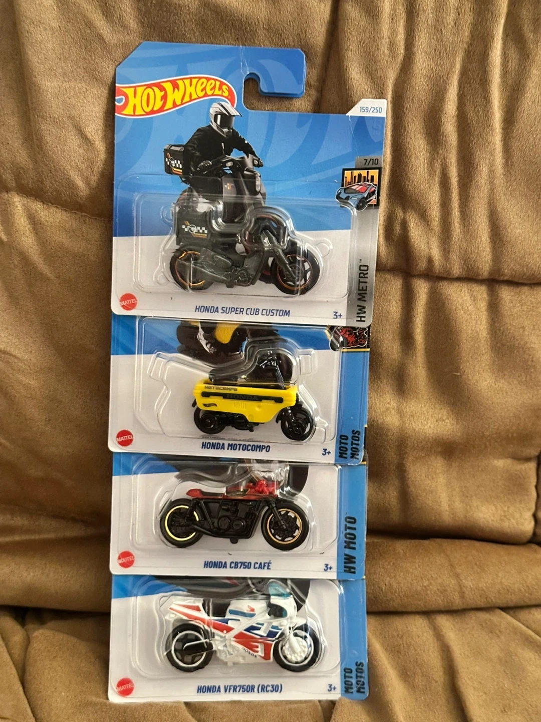 Collection of four Hot Wheels Honda motorcycles. Includes Honda CB750 Cafe, Honda Super Cub Custom, Honda Motocompo, and Honda VFR750R (RC30). All are new in packaging.