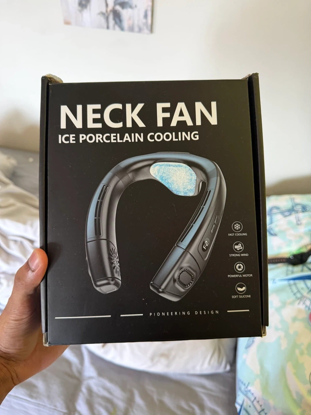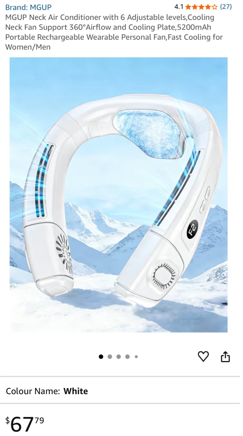 This portable neck fan has 6 adjustable levels and 360° airflow. It features a 5200mAh battery for fast cooling. Soft silicone neckband for comfort. Rechargeable design.