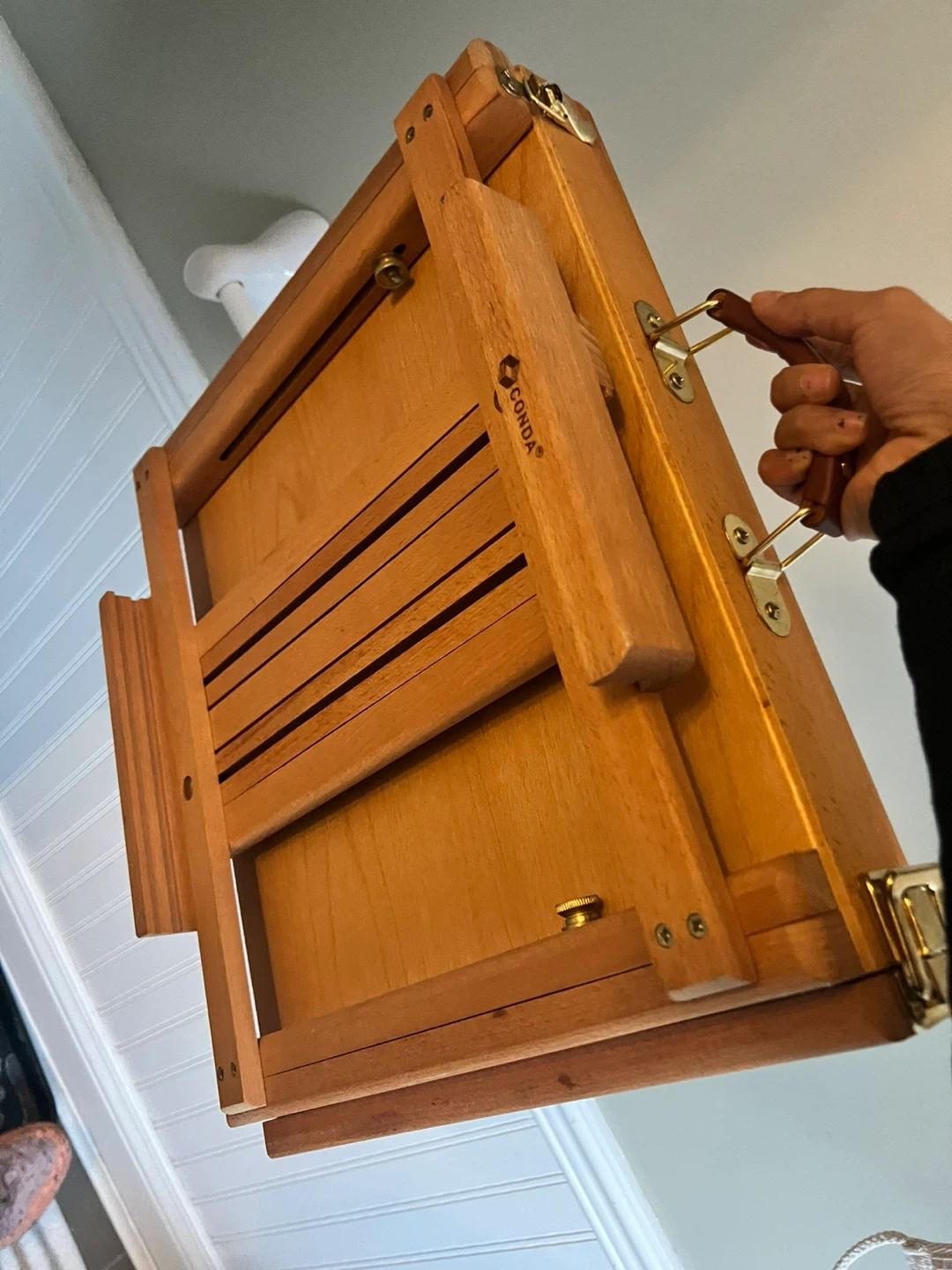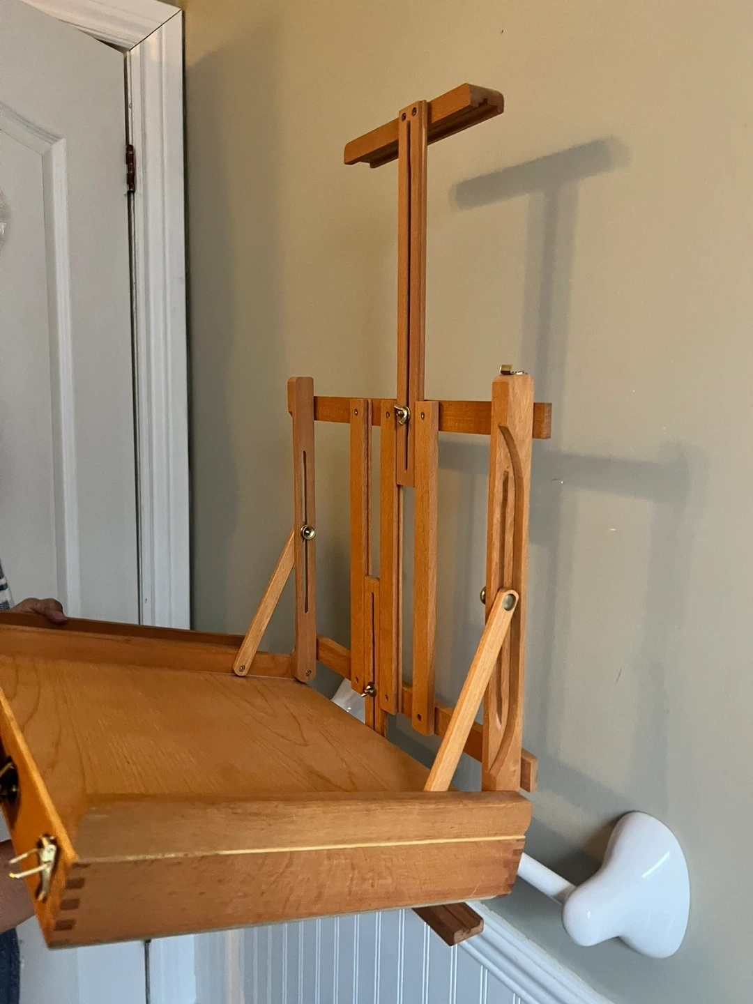 This wooden tabletop easel is portable and includes a storage drawer with dividers. It's made of durable wood, perfect for artists on the go. The easel is adjustable for various canvas sizes.