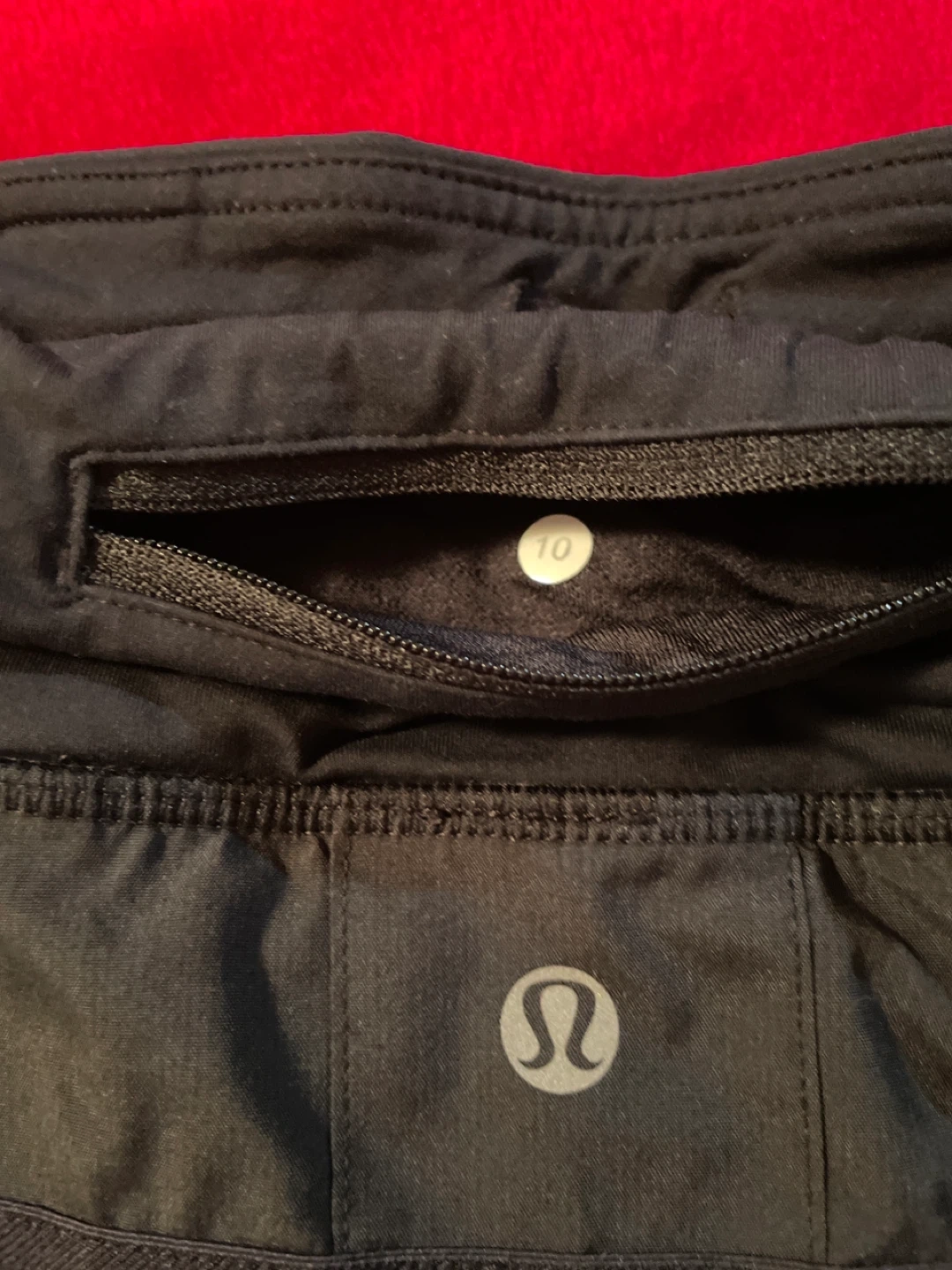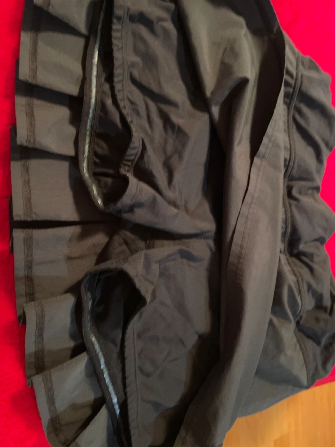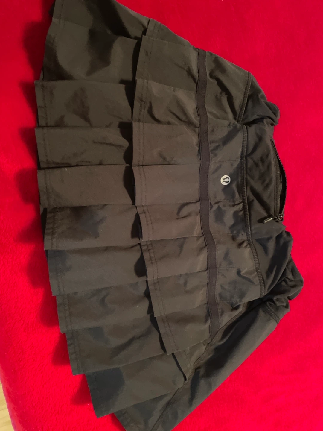 A Lululemon skirt in black. It features a pleated design with ribbon detailing. Material is nylon.Built in shorts with zipper pocket on back waist. Size 10.
