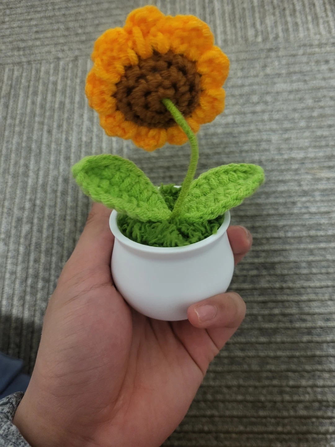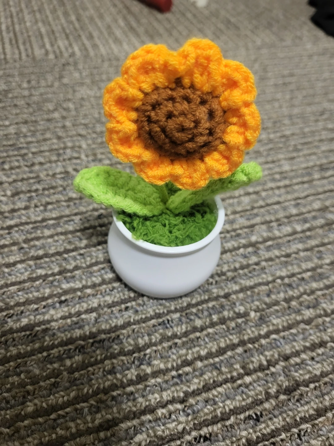 A cute, handcrafted potted sunflower made with yarn. It features bright orange petals, a brown centre, and green leaves in a small white pot. This little plant won't need watering!