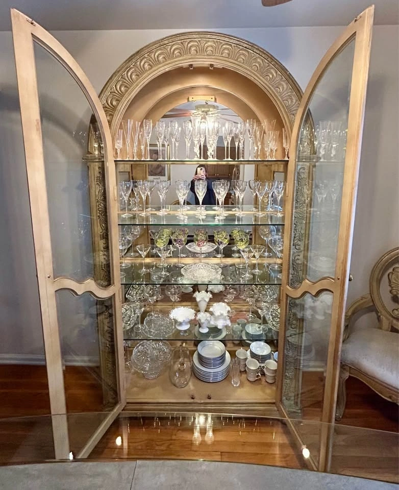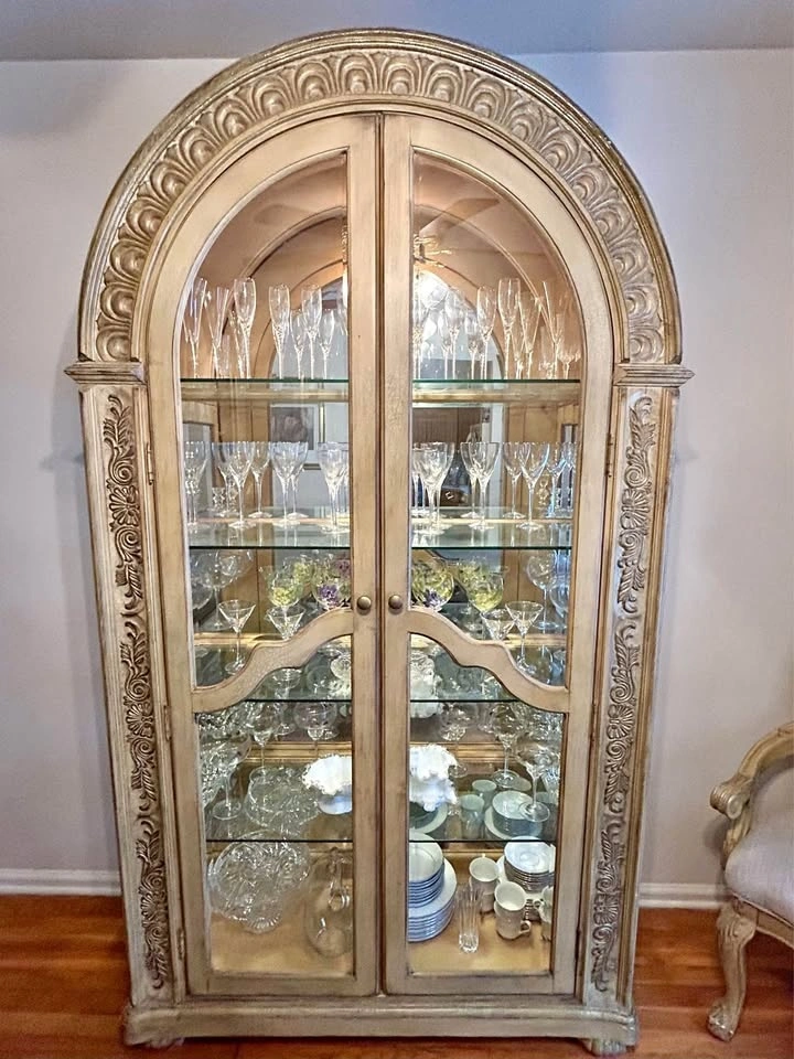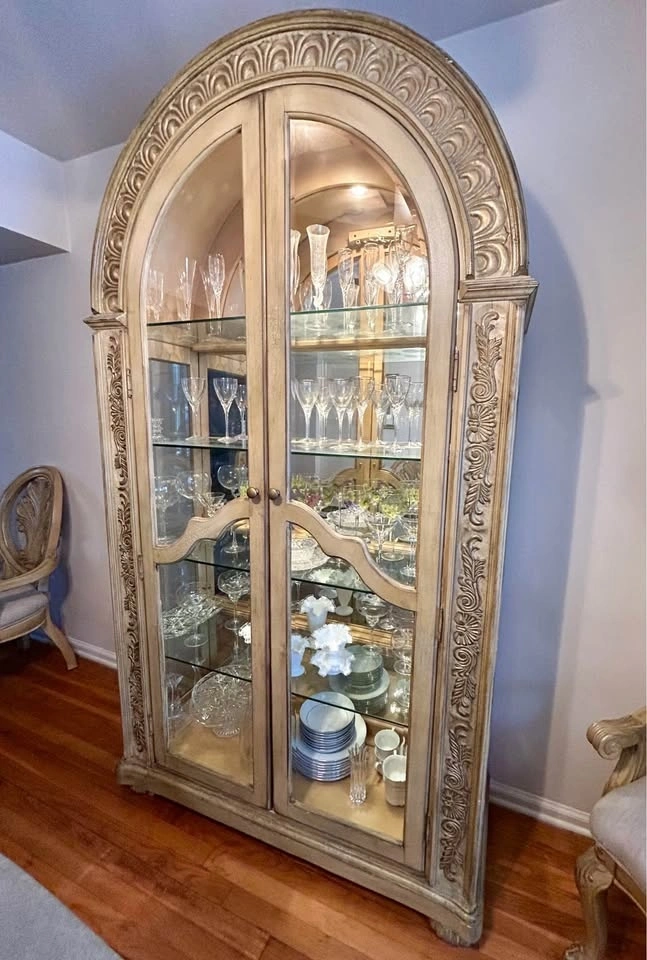 Beautifully detailed with ornate carvings. Features glass doors, four glass shelves, and a mirrored back panel. Elegant arched top and internal lighting. This is a beautiful piece to showcase fine china, stemware, or any collection.