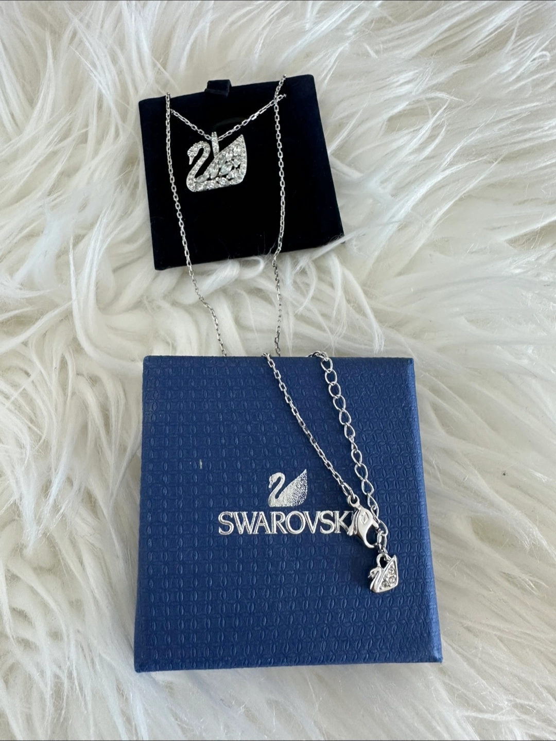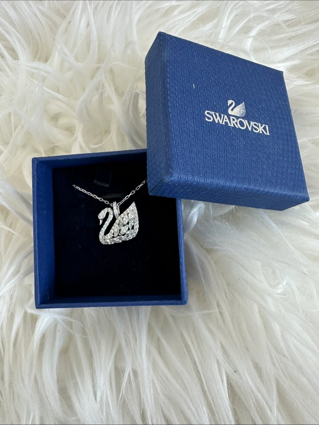 Elegant Swarovski swan necklace. Silver-toned chain and pendant. Crystals sparkle. Comes with original box.