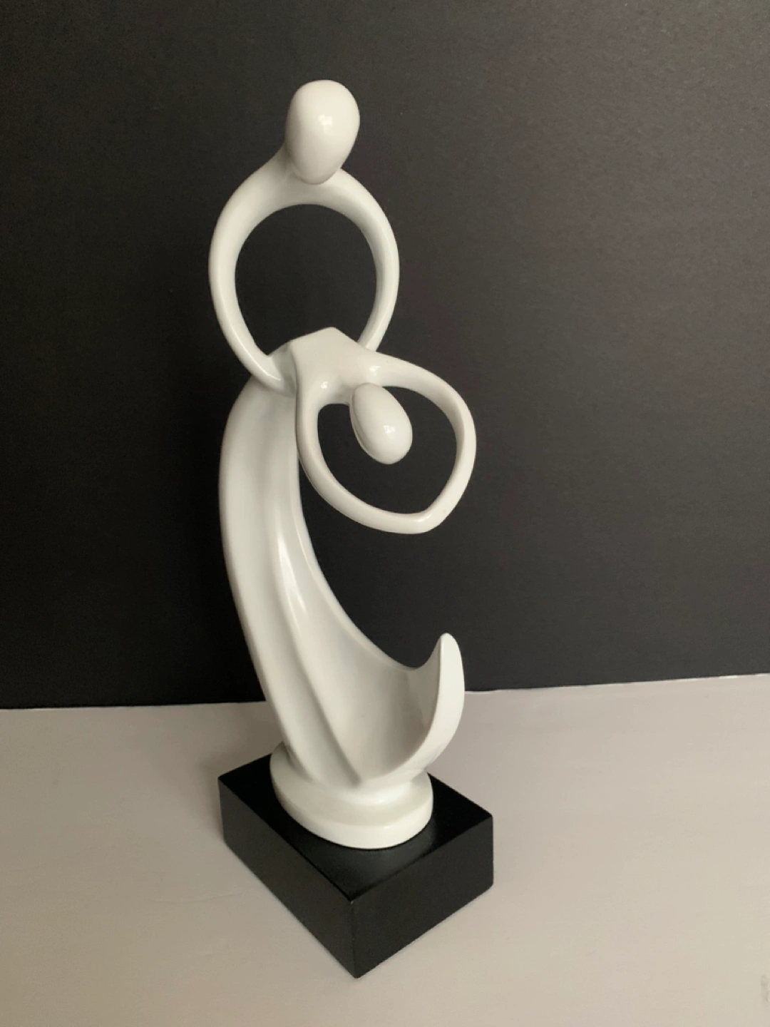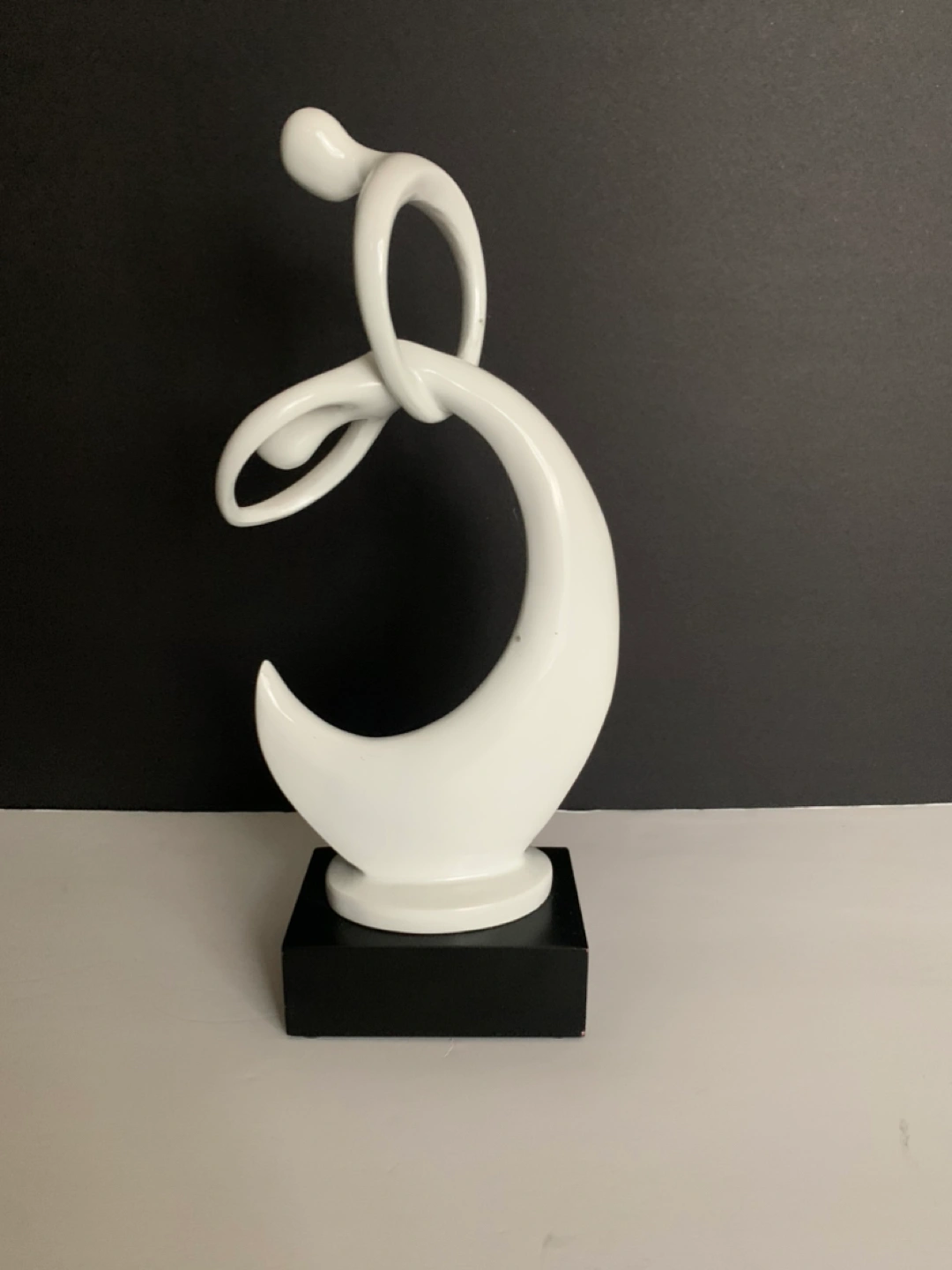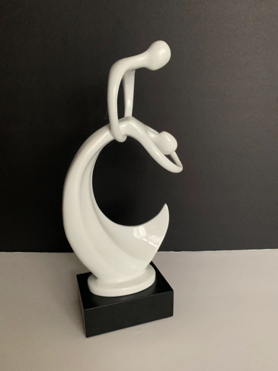 Beautiful unique ceramic statue on dark wood base, depicting dancers in a graceful embrace/dip.