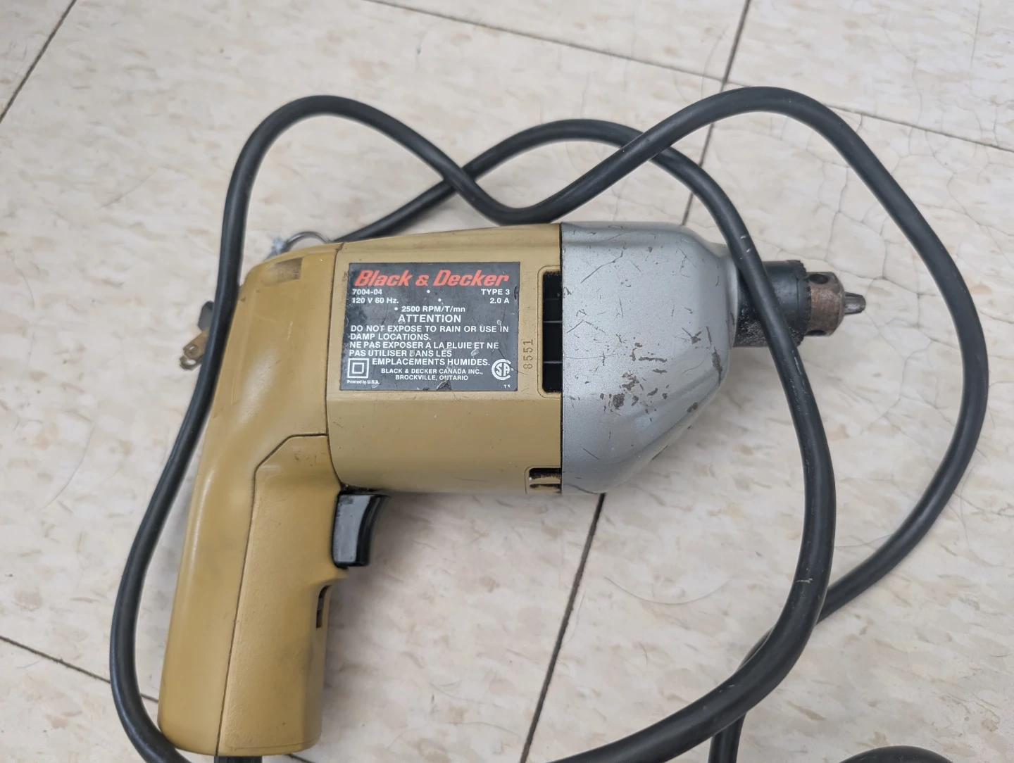 This is a corded Black & Decker drill. It features a 3000 RPM motor and operates at 120V, 60 Hz with 2.5 A. It's a reliable tool for various home projects.$60