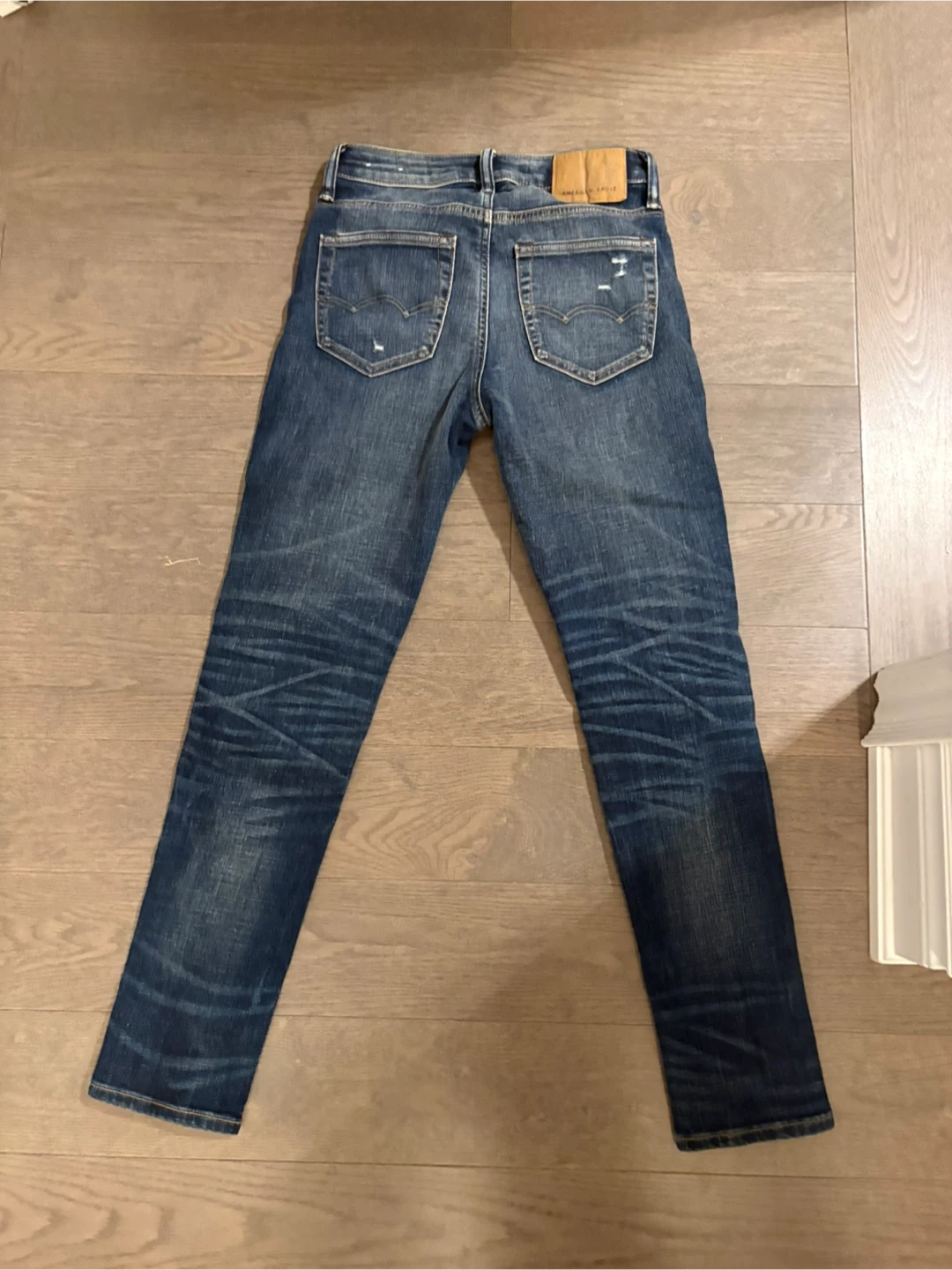 Blue distressed jeans from American Eagle. Denim material. These jeans have a unique distressed look with rips and fading.