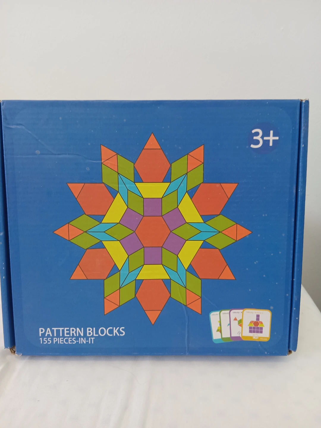 This set includes 155 pattern blocks for creating colourful designs. It's recommended for ages 3 and up. These blocks help develop spatial reasoning and creativity!