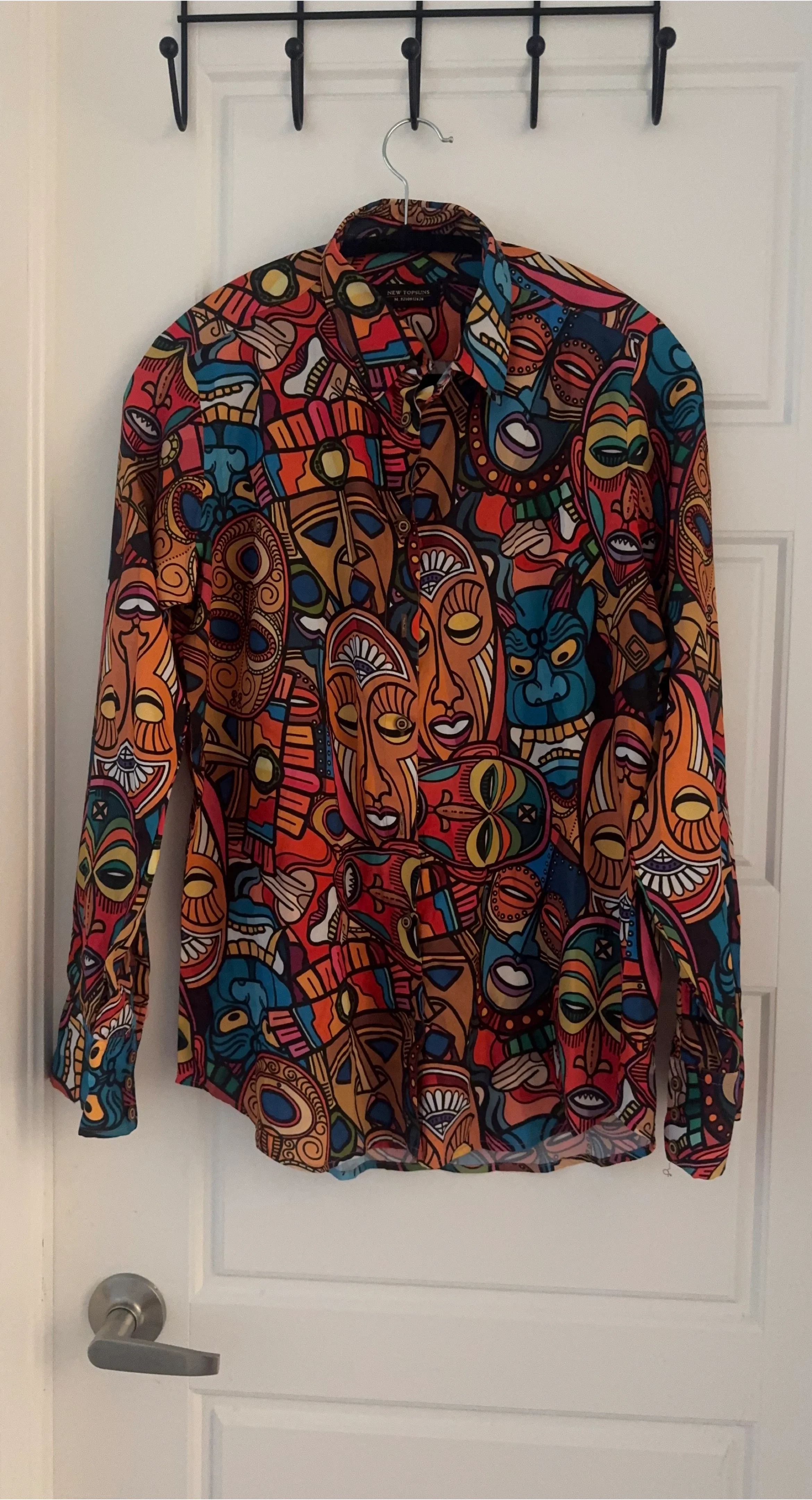 This NEW TOP SUNS long-sleeve shirt features a vibrant, all-over print of abstract faces. It's a stylish button-up with a classic collar. Great for adding a pop of colour to any outfit!