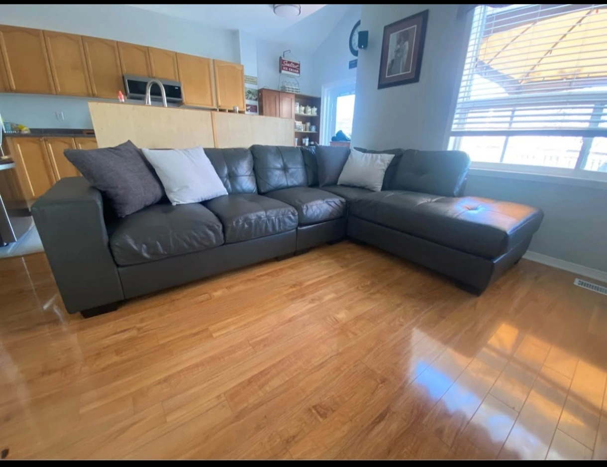 Dark colored leather sectional. Large sofa. L-Shaped grey sofa. 9βx7β. Comes apart 4 different sections.