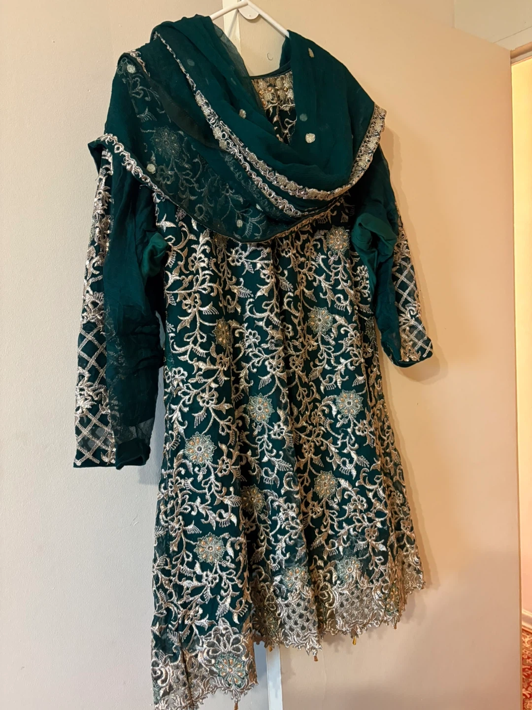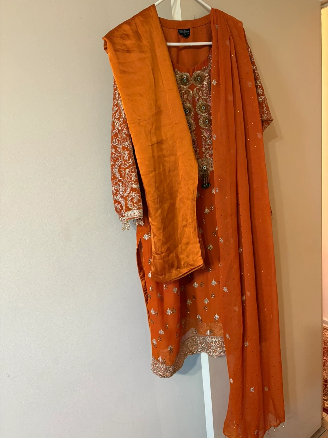 This is a beautiful orange kurti with intricate embroidery and a matching dupatta. It features detailed silver and gold threadwork throughout the garment. The set also includes coordinating pants.