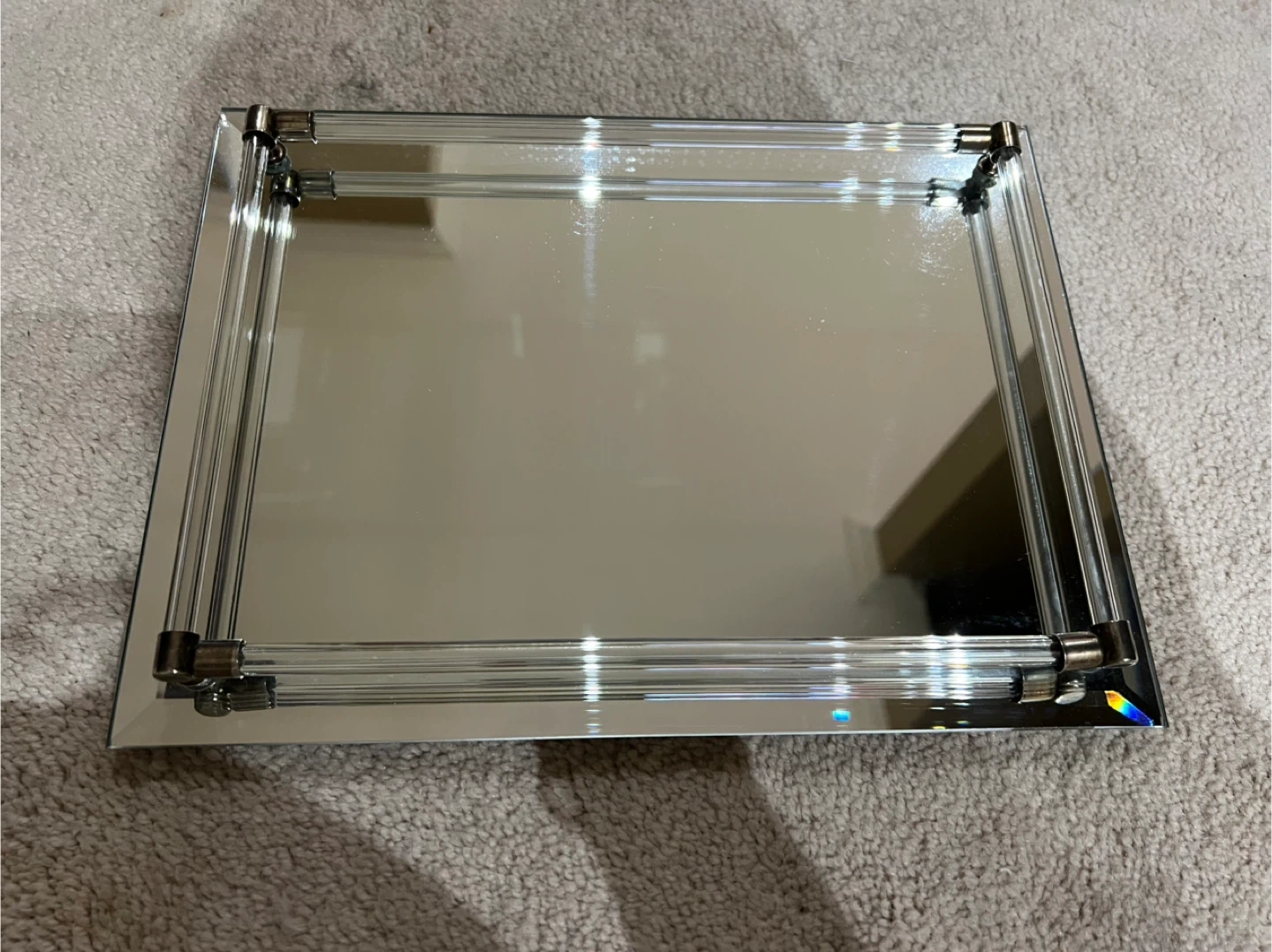 This decorative mirror features a beveled edge and a stylish frame with clear acrylic rods and silver-toned accents. It's a great addition for entryways or dressing tables. Mirror surface is clean, but there's a small chip on one corner of the glass.