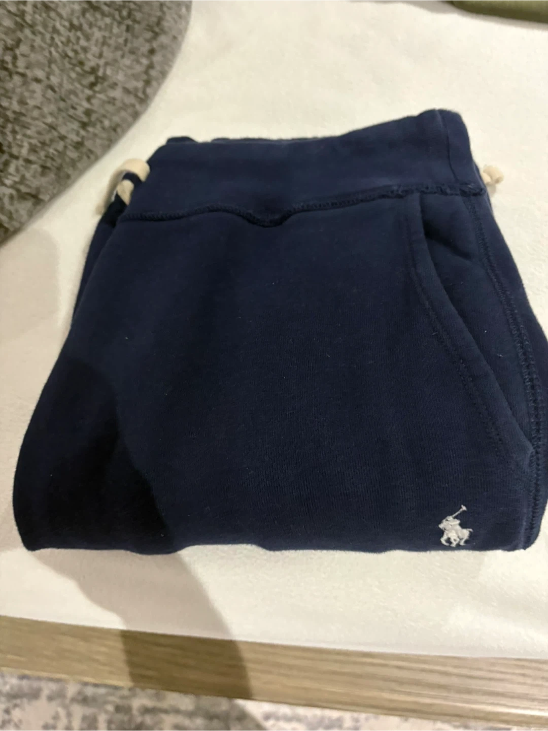 Classic navy blue joggers from Ralph Lauren. These sweatpants feature the iconic pony logo. They're made from a comfortable cotton blend, perfect for casual wear.