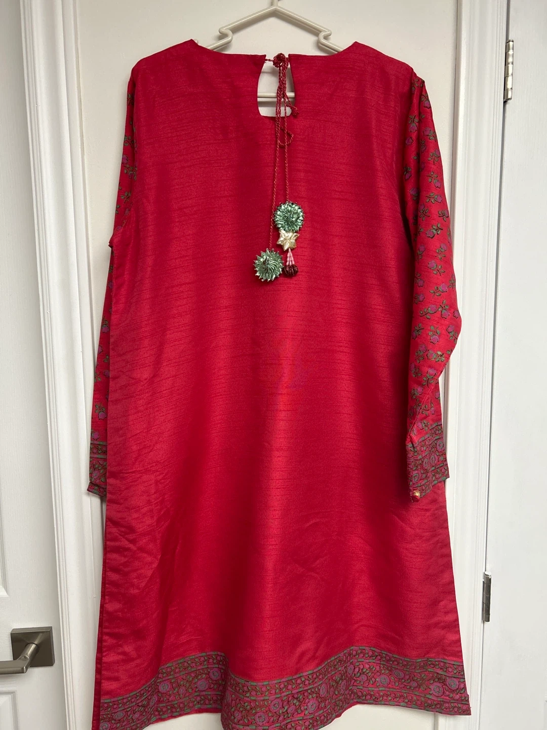 This Generation Formals set features a vibrant red kurta with a floral print and matching red pants. The kurta has long sleeves and a detailed border at the hem. A coordinating red dupatta with gold trim is also included. It's a size 14. This outfit would be lovely for a family gathering or cultural event!