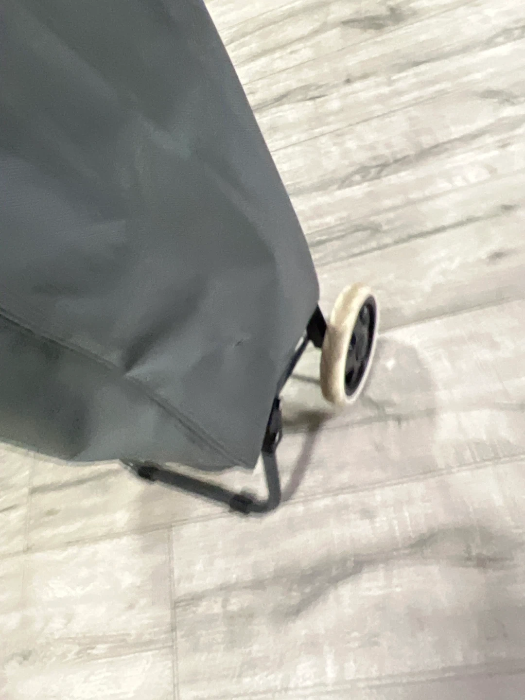 This is a grey shopping trolley bag with a drawstring closure and two wheels. It's made of fabric and has a metal frame for support. Perfect for carrying groceries or other items when you're out and about!