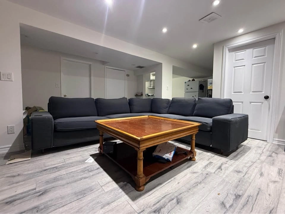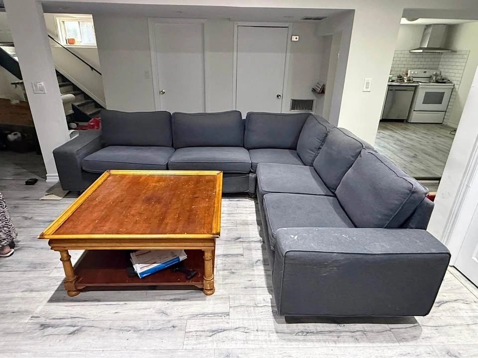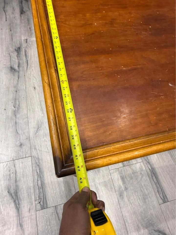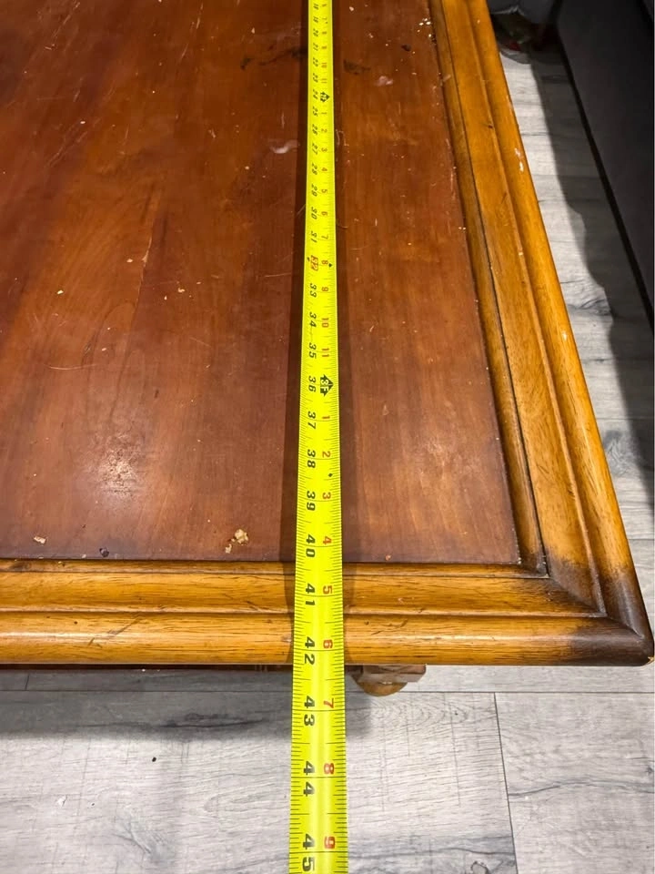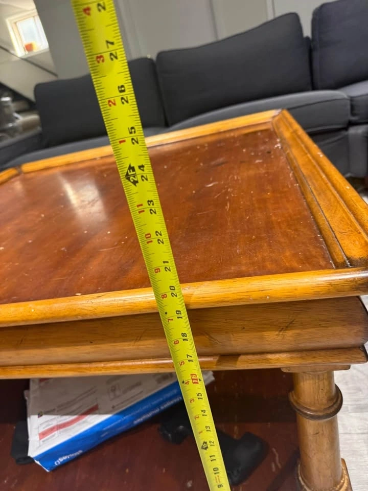 Sturdy wooden coffee table with a warm brown finish and classic design. It features a large square top with a raised edge and a full-length lower shelf for extra storage. Turned wood legs provide a traditional look. This piece is solid wood and has some surface wear from use. Estimated (WxDxH): 42 x 42 x 20 in.