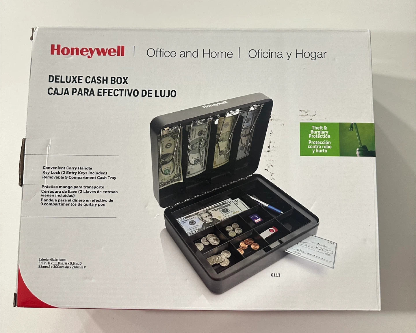 It has a removable 9 compartment cash tray for organizing bills and coins. Exterior dimensions are 3.5" H x 11.8" W x 9.6" D.