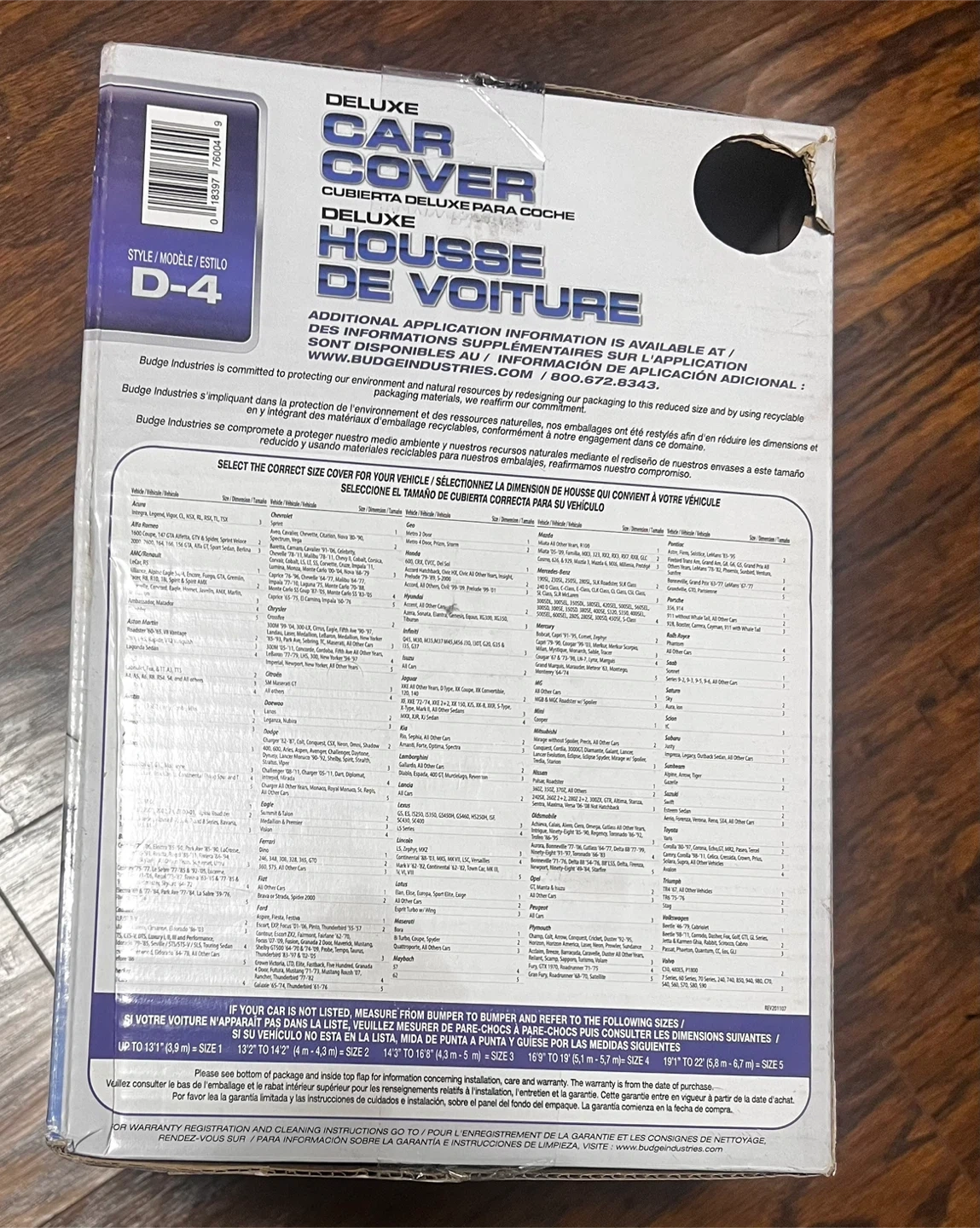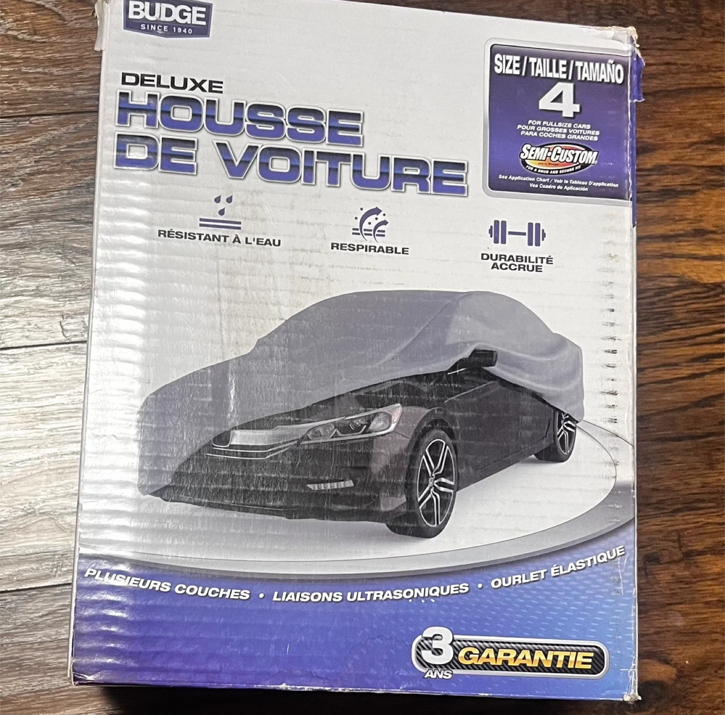 Selling a Budge Deluxe Car Cover, size 4! This cover is designed to protect your car with multiple layers and ultrasonic seams. It's water-resistant and breathable, ensuring increased durability. The cover also features a full elastic hem and reinforced grommets, plus it comes with a free storage bag. It fits cars that measure 19'1" to 22' (5.8 m - 6.7 m).