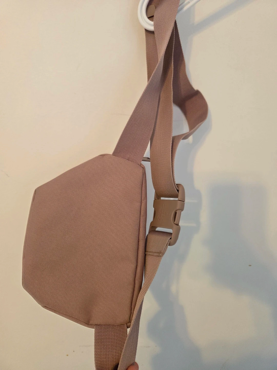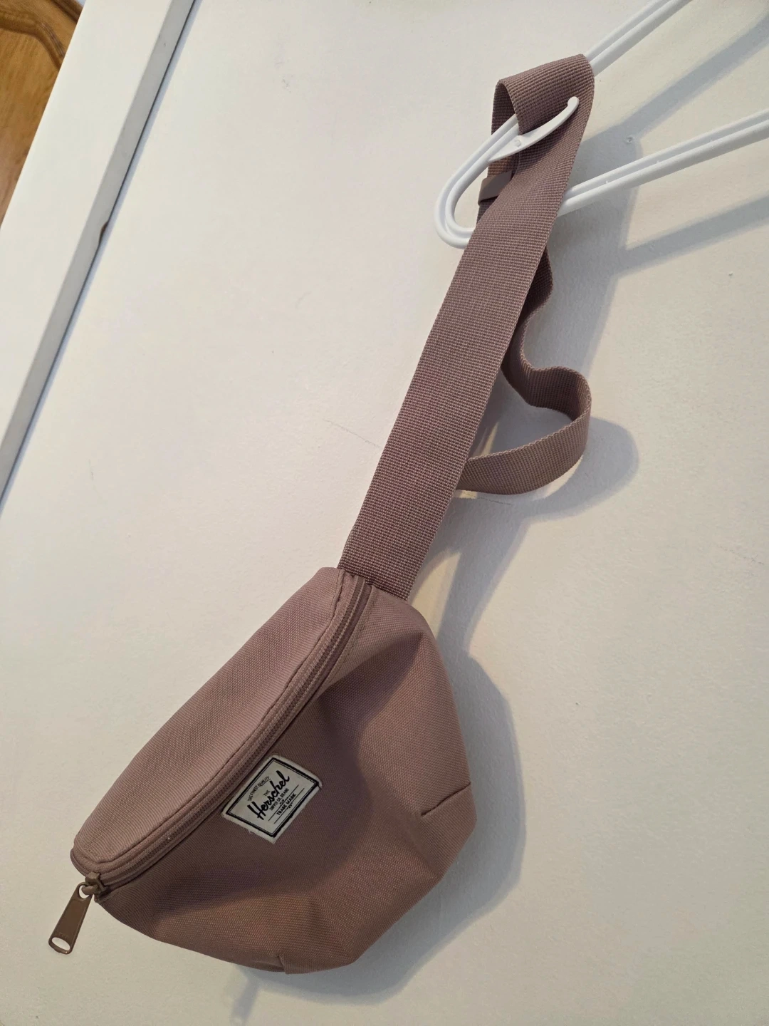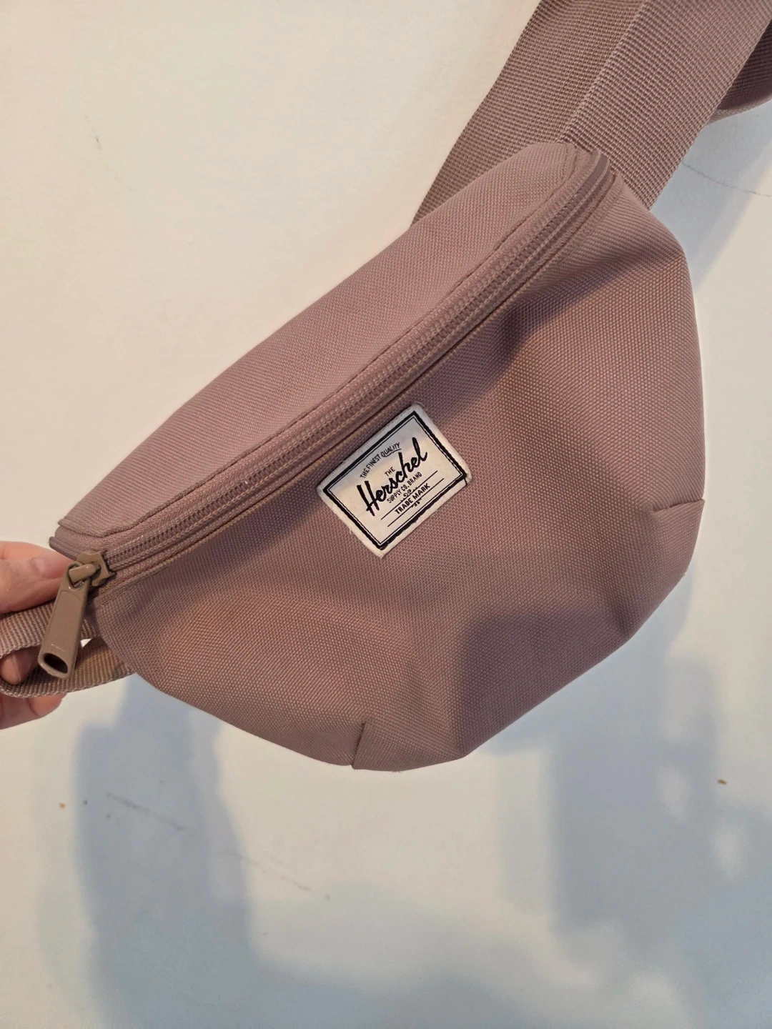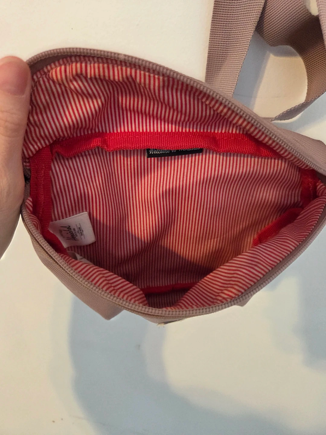 Herschel crossbody fanny pack in a muted mauve colour. It has a striped interior lining and an adjustable strap with a buckle closure. Zippered main compartment for secure storage. $10