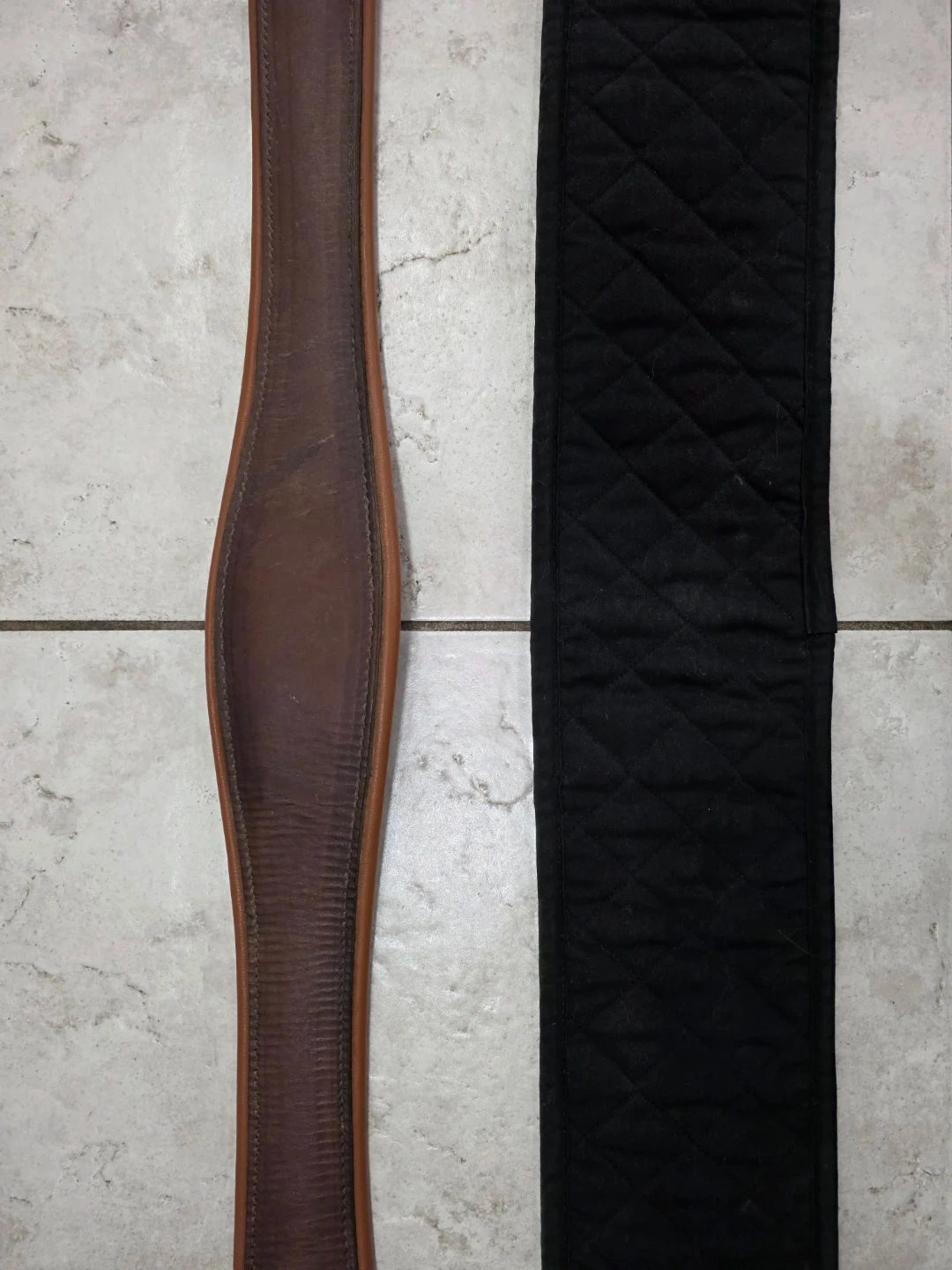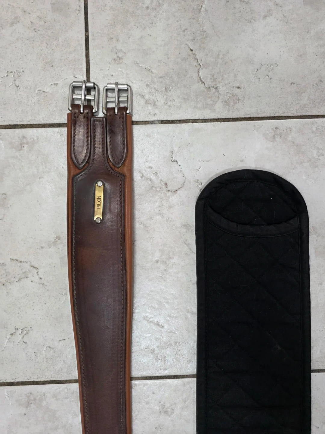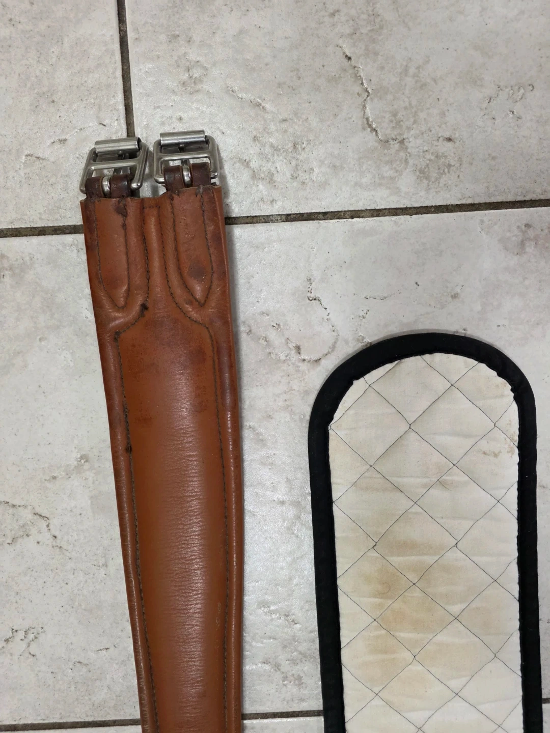 This is a English saddle girth made of brown leather with a padded underside for comfort.
