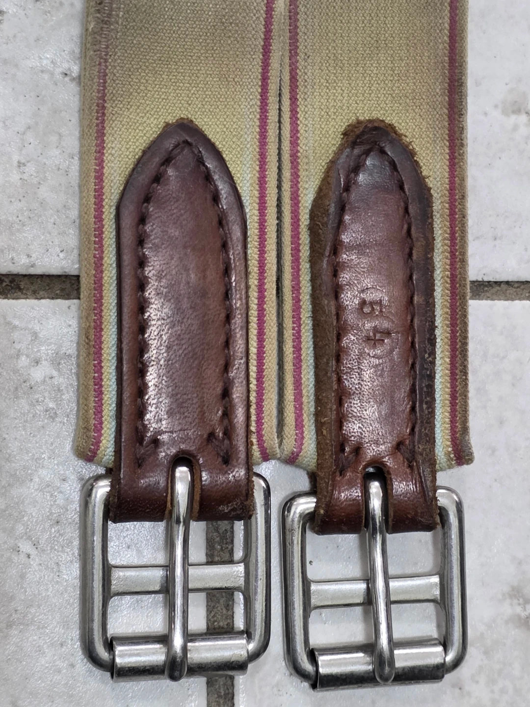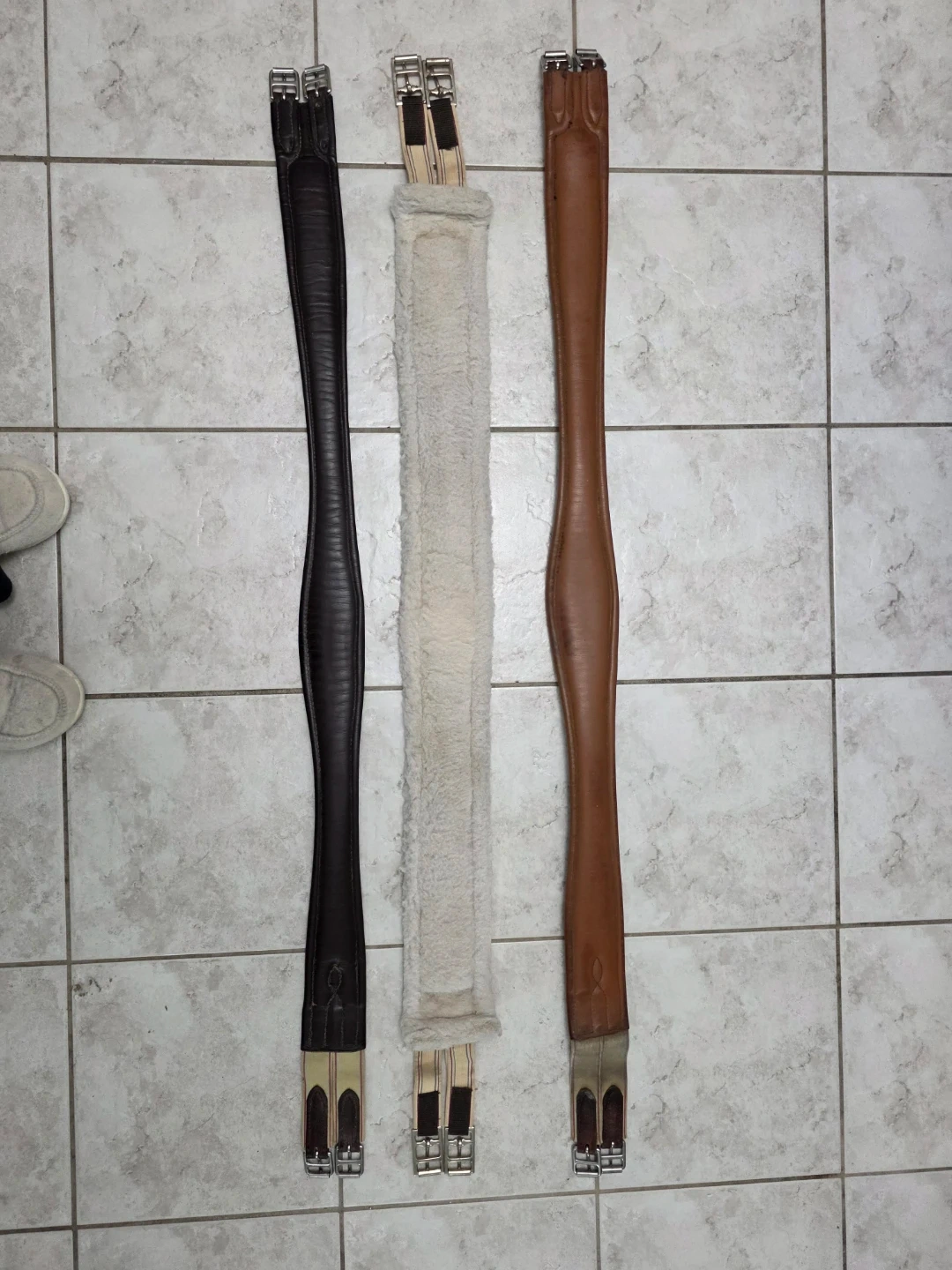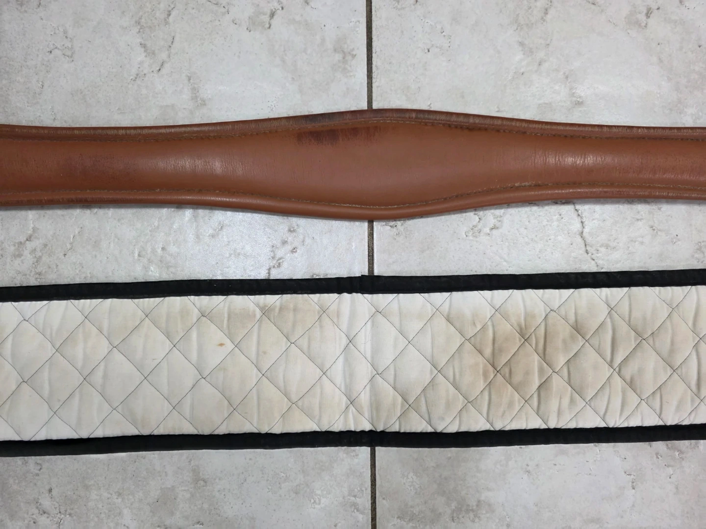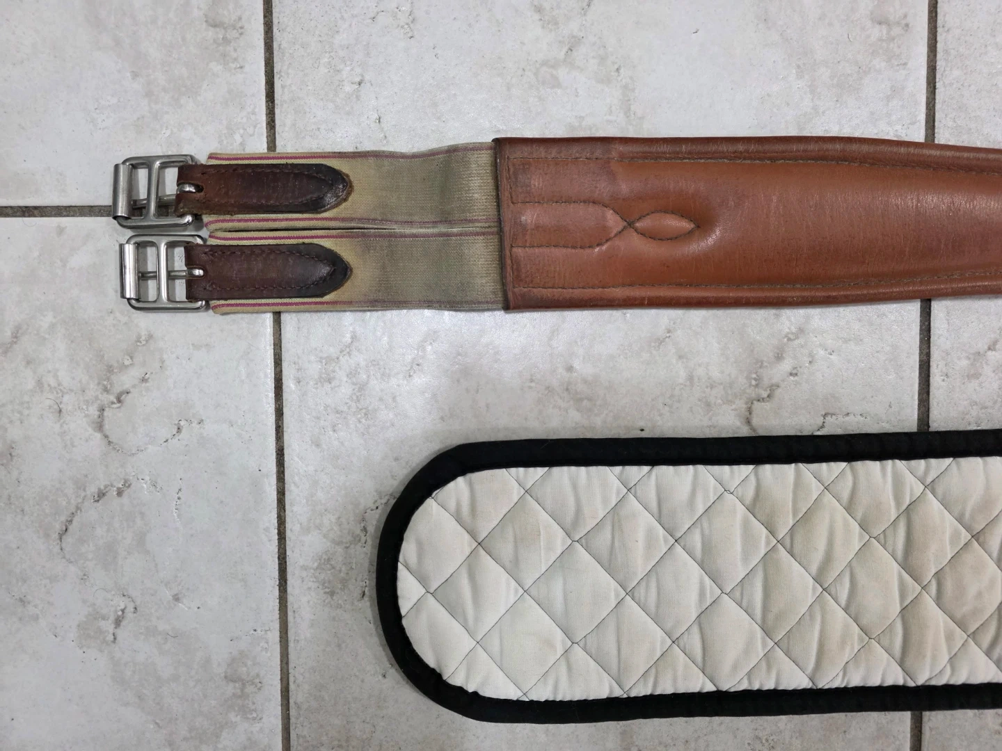 This is a English saddle girth made of brown leather with a padded underside for comfort.