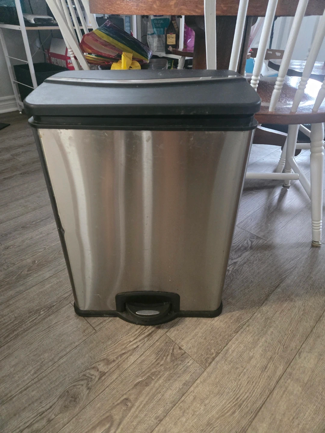 This stainless steel trash can has two separate compartments for easy sorting. It features a convenient step pedal for hands-free operation. The brushed metal finish looks sharp in any kitchen or workspace!